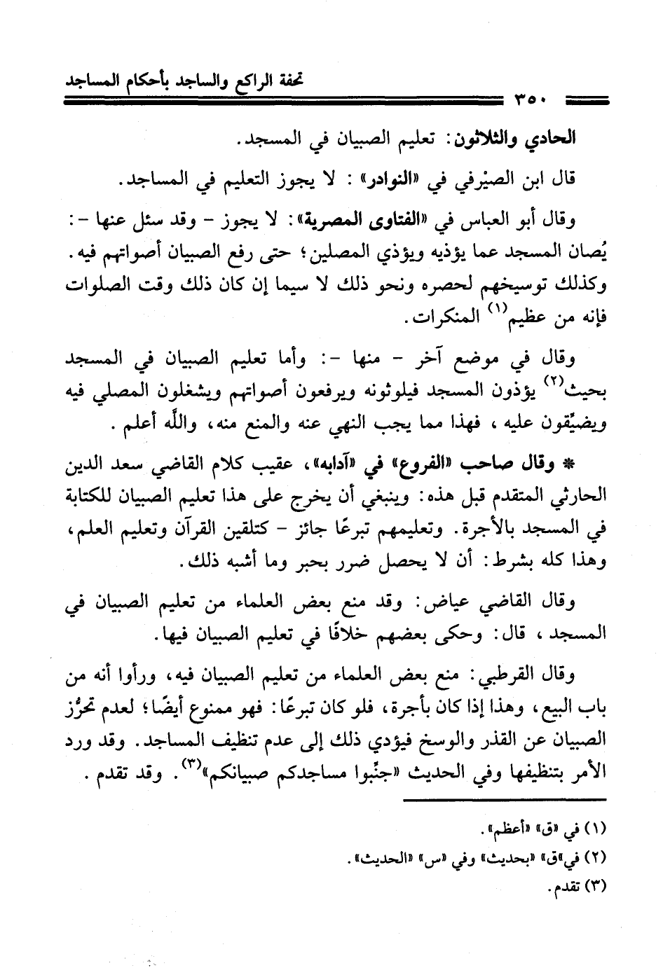 وقال في موضع آخر - منها -: وأما تعليم الصبيان في المسجد بحيث (¬2) يؤذون المسجد فيلوثونه ويرفعون أصواتهم ويشغلون المصلي فيه ويضيِّقون عليه، فهذا مما يجب النهي عنه والمنع منه، والله أعلم.