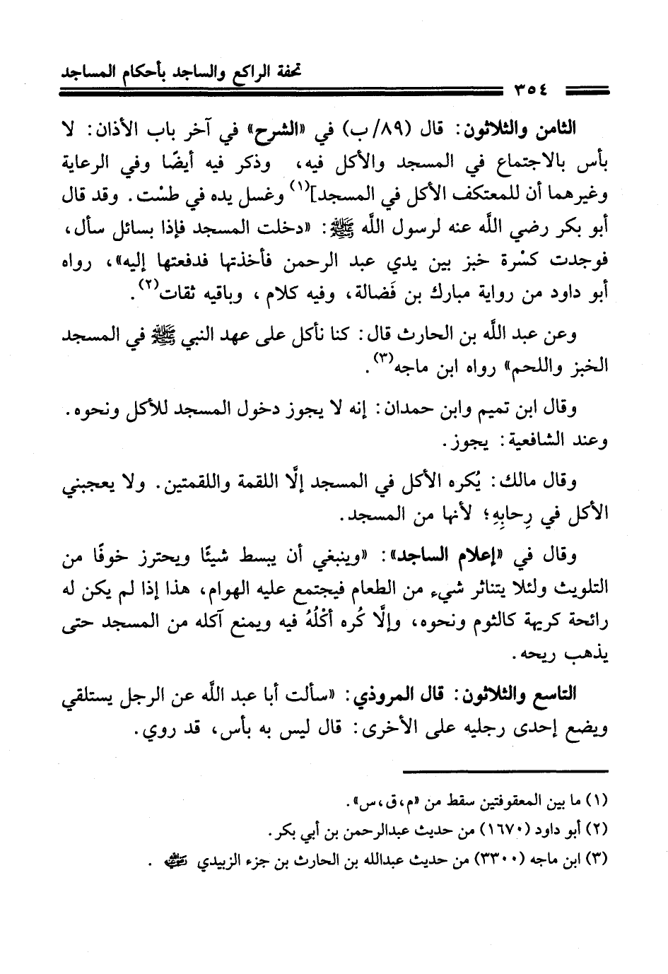 الثامن والثلاثون: قال (89/ ب) في "الشرح" في آخر باب الأذان: لا بأس بالاجتماع في المسجد والأكل فيه، وذكر فيه أيضًا وفي الرعاية وغيرهما أن للمعتكف الأكل في المسجد] (¬1) وغسل يده في طسْت. وقد قال أبو بكر رضي الله عنه لرسول الله - صلى الله عليه وسلم -: "دخلت المسجد فإذا بسائل سأل، فوجدت كسْرة خبز بين يدي عبد الرحمن فأخذتها فدفعتها إليه"، رواه أبو داود من رواية مبارك بن فَضالة، وفيه كلام، وباقيه ثقات (¬2).