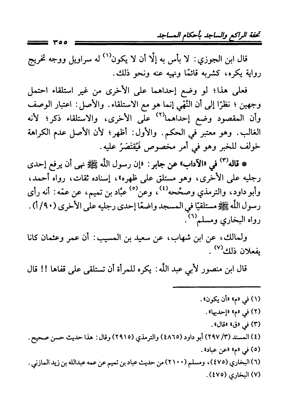 * قاله (¬3) في "الآداب" عن جابر: "إن رسول الله - صلى الله عليه وسلم - نهى أن يرفع إحدى رجليه على الأخرى، وهو مستلق على ظهره"، إسناده ثقات، رواه أحمد، وأبو داود، والترمذي وصحّحه (¬4)، وعن (¬5) عبَّاد بن تميم، عن عمّه: أنه رأى رسول الله - صلى الله عليه وسلم - مستلقيًا في المسجد واضعًا إحدى رجليه على الأخرى (90/ أ). رواه البخاري ومسلم (¬6).
