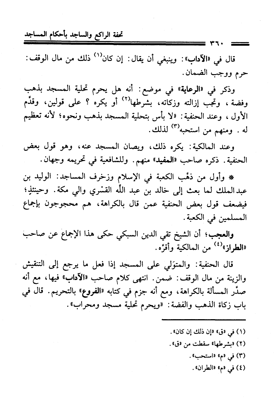 قال الحنفية: والمتوَلي على المسجد إذا فعل ما يرجع إلى التنقيش والزينة من مال الوقف: ضمن. انتهى كلام صاحب "الآداب" فيها، مع أنه صدَّر المسألة بالكراهة، ومع أنه جزم في كتابه "الفروع" بالتحريم. قال في باب زكاة الذهب والفضة: "ويحرم تحلية مسجد ومحراب".