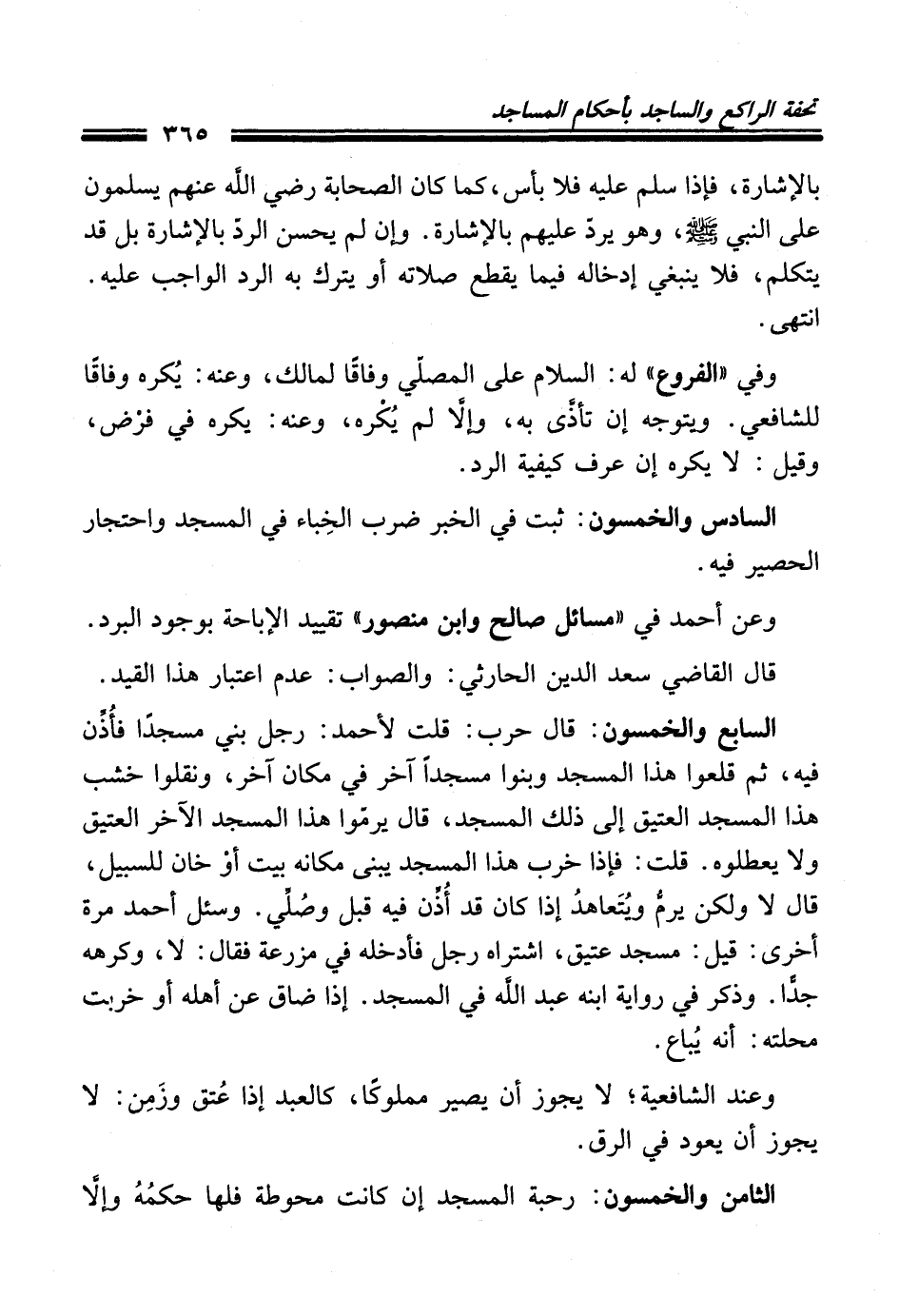السابع والخمسون: قال حرب: قلت لأحمد: رجل بني مسجدًا فأُذَّن فيه، ثم قلعوا هذا المسجد وبنوا مسجدًا آخر في مكان آخر، ونقلوا خشب هذا المسجد العتيق إلى ذلك المسجد، قال يرمّوا هذا المسجد الآخر العتيق ولا يعطلوه. قلت: فإذا خرب هذا المسجد يبنى مكانه بيت أوْ خان للسبيل، قال لا ولكن يرمُّ ويُتَعاهدُ إذا كان قد أُذِّن فيه قبل وصُلِّي. وسئل أحمد مرة أخرى: قيل: مسجد عتيق، اشتراه رجل فأدخله في مزرعة فقال: لا، وكرهه جدًّا. وذكر في رواية ابنه عبد الله في المسجد. إذا ضاق عن أهله أو خربت محلتَه: أنه يُباع.