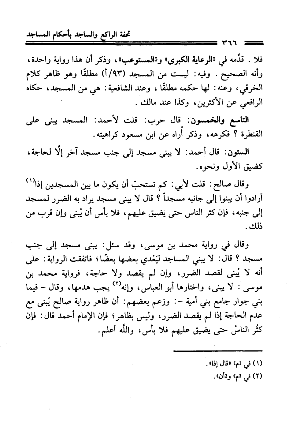 الستون: قال أحمد: لا يبنى مسجد إلى جنب مسجد آخر إلا لحاجة، كضيق الأول ونحوه.