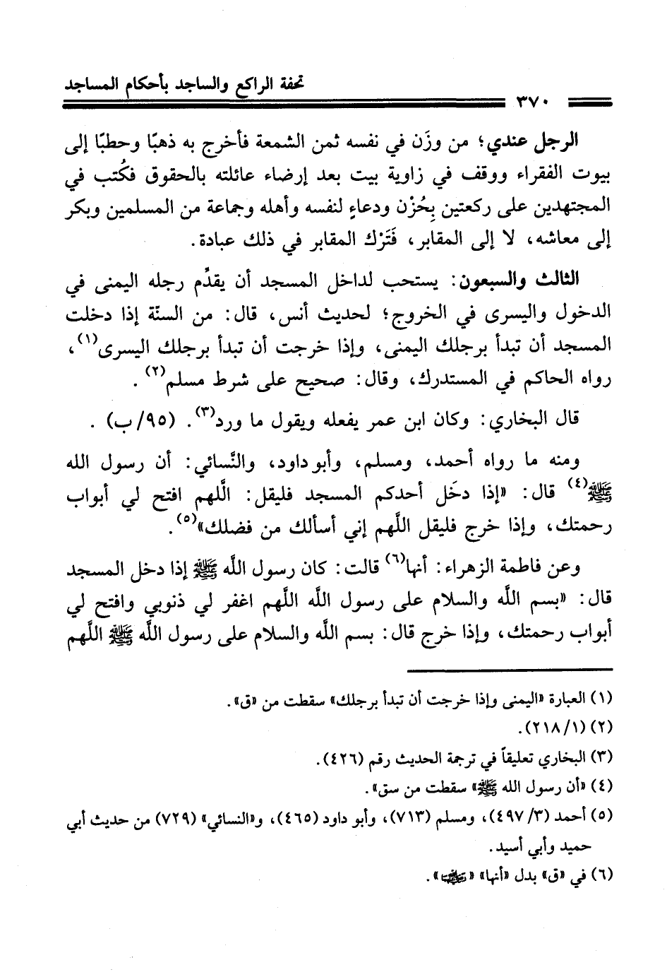 الثالث والسبعون: يستحب لداخل المسجد أن يقدّم رجله اليمنى في الدخول واليسرى في الخروج؛ لحديث أنس، قال: من الستة إذا دخلت المسجد أن تبدأ برجلك اليمنى، وإذا خرجت أن تبدأ برجلك اليسرى (¬1)، رواه الحاكم في المستدرك، وقال: صحيح على شرط مسلم (¬2).