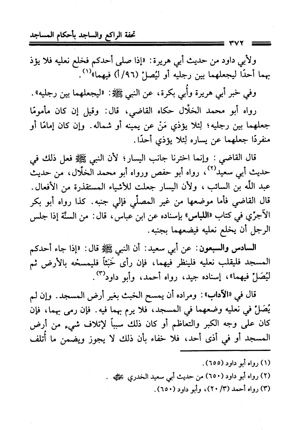 السادس والسبعون: عن أبي سعيد: أن النبي - صلى الله عليه وسلم - قال: "إذا جاء أحدكم المسجد فليقلب نعليه فلينظر فيهما، فإن رأى خَبَثًا فليمسحْه بالأرض ثم ليُصَلِّ فيهما"، إسناده جيد، رواه أحمد، وأبو داود (¬3).