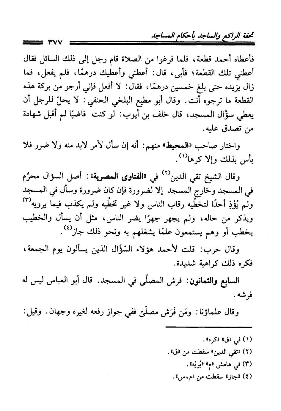 فأعطاه أحمد قطعة، فلما فرغوا من الصلاة قام رجل إلى ذلك السائل فقال أعطني تلك القطعة؛ فأبى، قال: أعطني وأعطيك درهمًا، فلم يفعل، فما زال يزيده حتى بلغ خمسين درهمًا، فقال: لا أفعل فإني أرجو من بركة هذه القطعة ما ترجوه أنت. وقال أبو مطيع البلخي الحنفي: لا يحلّ للرجل أن يعطي سؤَّال المسجد، قال خلف بن أيوب: لو كنت قاضيًا لم أقبل شهادة من تصدق عليه.