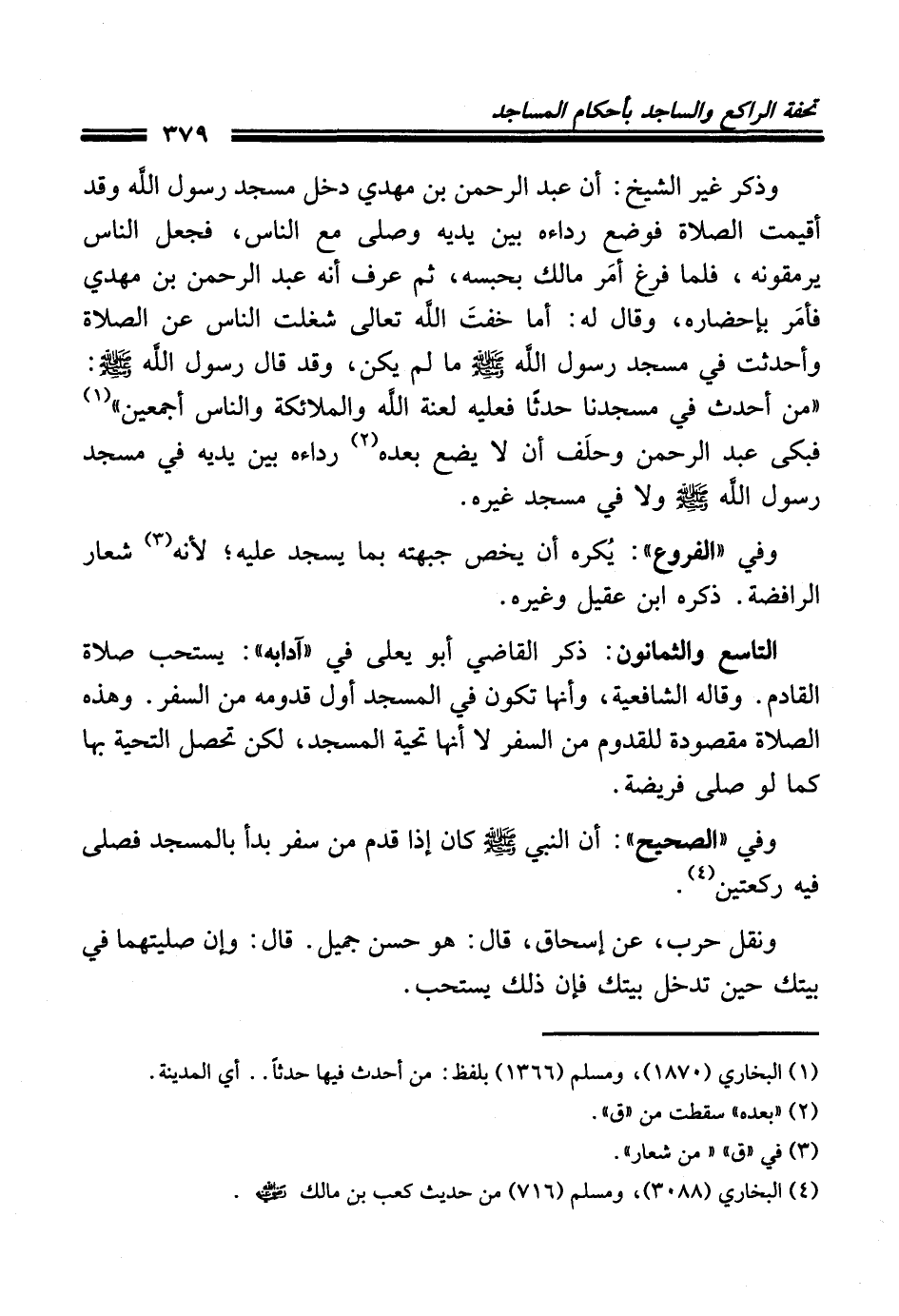وذكر غير الشيخ: أن عبد الرحمن بن مهدي دخل مسجد رسول الله وقد أقيمت الصلاة فوضع رداءه بين يديه وصلى مع الناس، فجعل الناس يرمقونه، فلما فرغ أمَر مالك بحبسه، ثم عرف أنه عبد الرحمن بن مهدي فأمَر بإحضاره، وقال له: أما خفتَ الله تعالى شغلت الناس عن الصلاة وأحدثت في مسجد رسول الله - صلى الله عليه وسلم - ما لم يكن، وقد قال رسول الله - صلى الله عليه وسلم -: "من أحدث في مسجدنا حدثًا فعليه لعنة الله والملائكة والناس أجمعين" (¬1) فبكى عبد الرحمن وحلَف أن لا يضع بعده (¬2) رداءه بين يديه في مسجد رسول الله - صلى الله عليه وسلم - ولا في مسجد غيره.