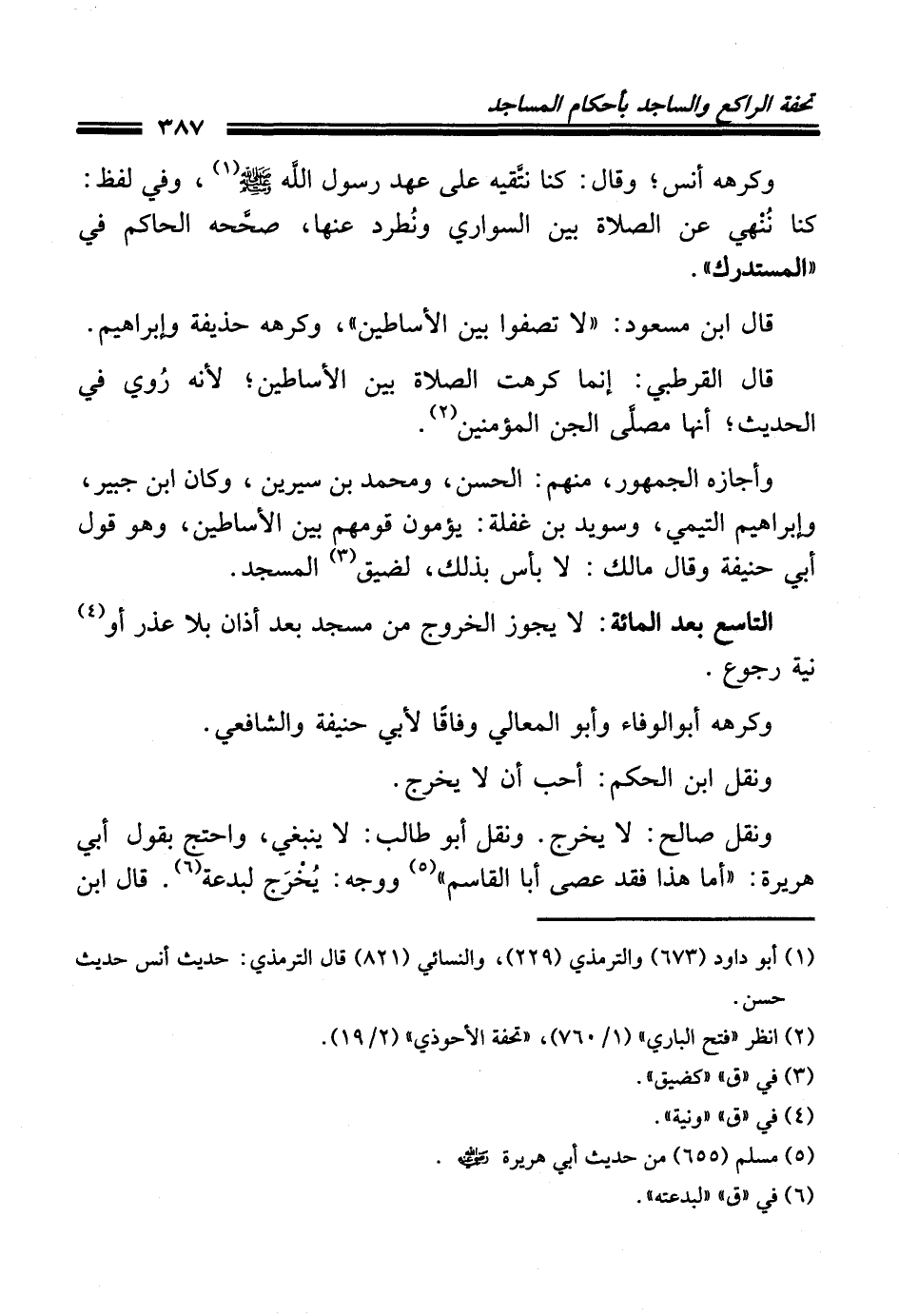 وكرهه أنس؛ وقال: كنا نتَّقيه على عهد رسول الله - صلى الله عليه وسلم - (¬1)، وفي لفظ: كنا نُنْهي عن الصلاة بين السواري ونُطرد عنها، صحَّحه الحاكم في "المستدرك".