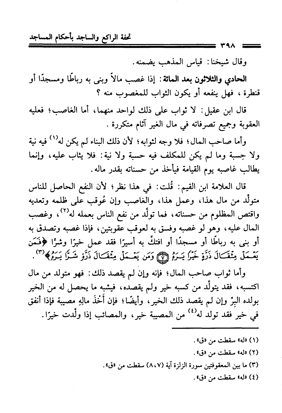 قال العلامة ابن القيم: قُلت: في هذا نظر؛ لأن النفع الحاصل للناس متولِّد من مال هذا، وعمل هذا، والغاصب وإن عُوقب على ظلمه وتعديه واقتص المظلوم من حسناته، فما تولّد من نفع الناس بعمله له (¬2)، وغصب المال عليه، وهو لو غصبه وفسق به لعوقب عقوبتين، فإذا غصبه وتصدق به أو بنى به رباطًا أو مسجدًا أو افتكَّ به أسيرًا فقد عمل خيرًا وشرًا {فَمَنْ يَعْمَلْ مِثْقَالَ ذَرَّةٍ خَيْرًا يَرَهُ (7) وَمَنْ يَعْمَلْ مِثْقَالَ ذَرَّةٍ شَرًّا يَرَهُ} (¬3).