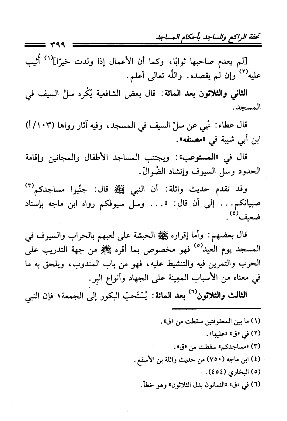 الثاني والثلاثون بعد المائة: قال بعض الشافعية يُكْره سلُّ السيف في المسجد.
