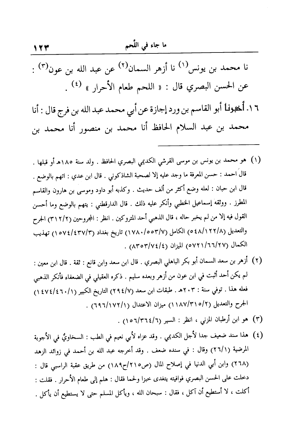 16- أَخْبَرَنَا أَبُو الْقَاسِمِ بْنُ وَرْدٍ إِجَازَةً عَنْ أَبِي مُحَمَّدٍ عَبْدِ اللَّهِ بْنِ فَرَجٍ قَالَ: أنا مُحَمَّدُ بْنُ عَبْدِ السَّلامِ الْحَافِظُ أنا مُحَمَّدُ بْنُ مَنْصُورٍ أنا مُحَمَّدُ بْنُ -[124]- عَبْدِ اللَّهِ بْنِ خَلادٍ نا أَحْمَدُ بْنُ مُحَمَّدِ بن سعيد المهداني نا مُحَمَّدُ بْنُ الْعَبَّاسِ بْنِ بَسَّامٍ نا مُحَمَّدُ بْنُ حَسَّانِ بْنِ زَيْدٍ الْمرّيُّ بِمَكَّةَ نا وَكِيعٌ عَنْ سُفْيَانَ عَنْ حَبِيبِ بْنِ أَبِي ثَابِتٍ عَنْ سَعِيدِ بْنِ جُبَيْرٍ عَنِ ابْنِ عَبَّاسٍ: عَنِ النَّبِيِّ صَلَّى اللَّهُ عَلَيْهِ وَسَلَّمَ قَالَ: " عَلَيْكُمْ بِاللَّحْمِ فَكُلُوهُ؛ فَإِنَّهُ يُحَسِّنُ الْخَلْقَ وَالْخُلُقَ ".