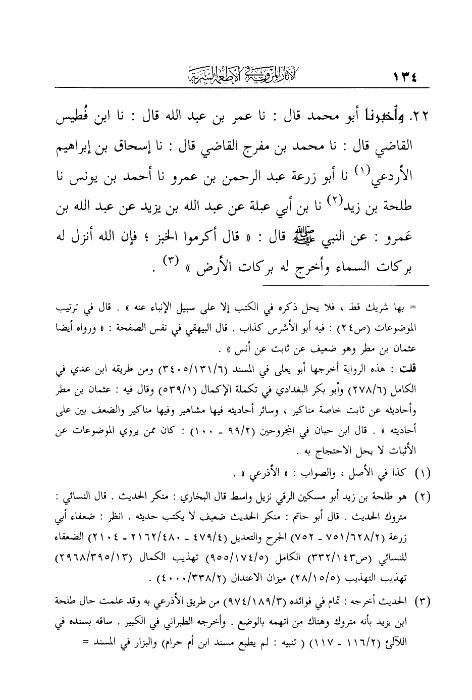 22- وأَخْبَرَنَا أَبُو مُحَمَّدٍ قَالَ: نا عُمَرُ بْنُ عَبْدِ اللَّهِ قَالَ: نا ابْنُ فُطَيْسٍ الْقَاضِي قَالَ: نا مُحَمَّدُ بْنُ مُفَرِّجٍ الْقَاضِي قَالَ: نا إِسْحَاقُ بْنُ إِبْرَاهِيمَ الأردعي نا أَبُو زُرْعَةَ عَبْدُ الرَّحْمَنِ بْنُ عَمْرٍو نا أَحْمَدُ بْنُ يُونُسَ نا طَلْحَةُ بْنُ زَيْدٍ نا بن أَبِي عَبْلَةَ عَنْ عَبْدِ اللَّهِ بْنِ يَزِيدَ عَنْ عَبْدِ اللَّهِ بْنِ عَمرو: عَنِ النَّبِيِّ صَلَّى اللَّهُ عَلَيْهِ وَسَلَّمَ قَالَ: " قَالَ أَكْرِمُوا الْخُبْزَ؛ فَإِنَّ اللَّهَ أَنْزَلَ لَهُ بَرَكَاتِ السَّمَاءِ وَأَخْرَجَ لَهُ بَرَكَاتِ الأَرْضِ ".