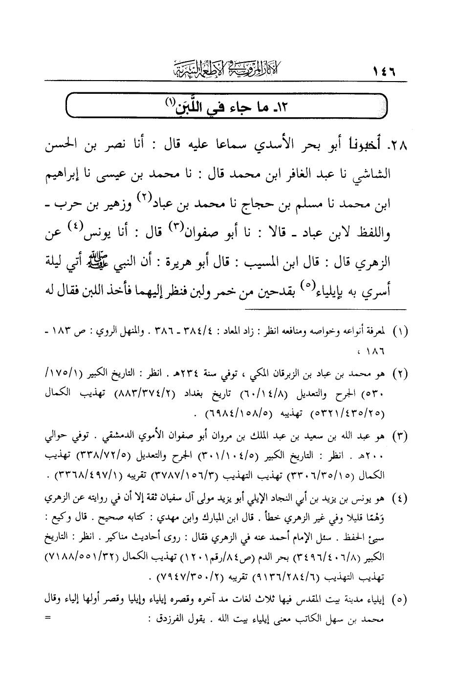 28- أَخْبَرَنَا أَبُو بَحْرٍ الأَسَدِيُّ سَمَاعًا عَلَيْهِ قَالَ: أنا نَصْرُ بْنُ الْحَسَنِ الشَّاشِيُّ نا عَبْدُ الْغَافِرِ بْنُ مُحَمَّدٍ قَالَ: نا مُحَمَّدُ بْنُ عِيسَى نا إِبْرَاهِيمُ بْنُ مُحَمَّدٍ نا مُسْلِمُ بْنُ حَجَّاجٍ نا مُحَمَّدُ بْنُ عَبَّادٍ وَزُهَيْرُ بْنُ حَرْبٍ - وَاللَّفْظُ لابْنِ عَبَّادٍ - قَالا: نا أَبُو صَفْوَانَ قَالَ: أنا يُونُسُ عَنِ الزُّهْرِيِّ قَالَ: قَالَ ابْنُ الْمُسَيَّبِ: قَالَ أَبُو هُرَيْرَةَ: أَنَّ النَّبِيَّ صَلَّى اللَّهُ عَلَيْهِ وَسَلَّمَ أُتِيَ لَيْلَةَ أُسْرِيَ بِهِ بِإِيلِيَاءَ بِقَدَحَيْنِ مِنْ خَمْرٍ وَلَبَنٍ فَنَظَرَ إِلَيْهِمَا فَأَخَذَ اللَّبَنَ فقَالَ لَهُ -[147]- جِبْرِيلُ: "الْحَمْدُ لِلَّهِ الَّذِي هَدَاكَ لِلْفِطْرَةِ لَوْ أَخَذْتَ الْخَمْرَ غَوَتْ أُمَّتَكَ ".