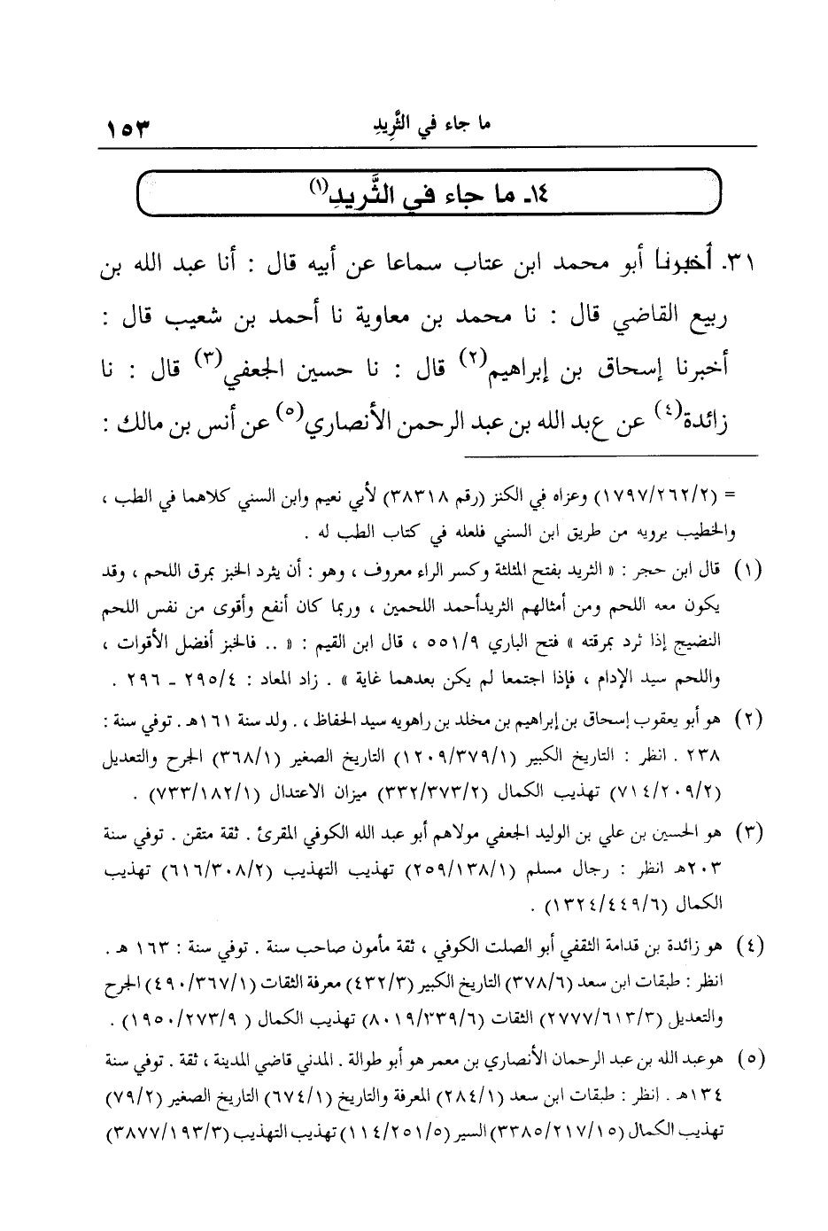 31- أَخْبَرَنَا أَبُو مُحَمَّدِ بْنُ عَتَّابٍ سَمَاعًا عَنْ أَبِيهِ قَالَ: أنا عَبْدُ اللَّهِ بْنُ رَبِيعٍ الْقَاضِي قَالَ: نا مُحَمَّدُ بْنُ مُعَاوِيَةَ نا أَحْمَدُ بْنُ شُعَيْبٍ قَالَ: أَخْبَرَنَا إِسْحَاقُ بْنُ إِبْرَاهِيمَ قَالَ: نا حُسَيْنٌ الْجُعْفِيُّ قَالَ: نا زَائِدَةُ عَنْ عَبْدِ اللَّهِ بْنِ عَبْدِ الرَّحْمَنِ الأَنْصَارِيِّ عَنْ أَنَسِ بْنِ مَالِكٍ: -[154]- عَنْ رَسُولِ اللَّهِ صَلَّى اللَّهُ عَلَيْهِ وَسَلَّمَ قَالَ: "فَضْلُ عَائِشَةَ عَلَى النِّسَاءِ كَفَضْلِ الثَّرِيدِ عَلَى سَائِرِ الطَّعَامِ".