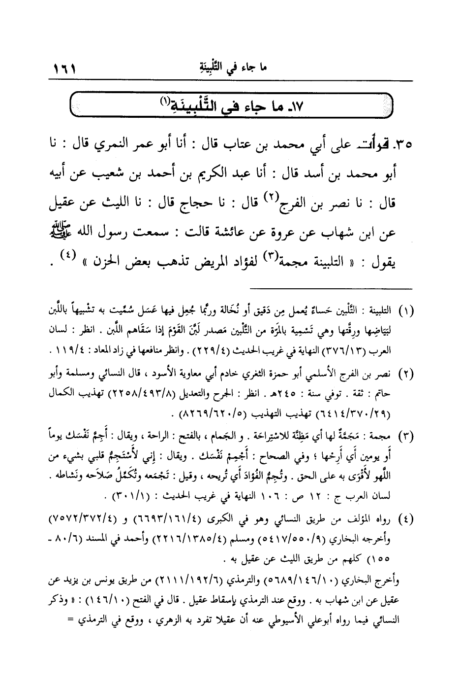 35- قَرَأْتُ عَلَى أَبِي مُحَمَّدِ بْنِ عَتَّابٍ قَالَ: أنا أَبُو عُمَرَ النَّمَرِيُّ قَالَ: نا أَبُو مُحَمَّدِ بْنُ أَسَدٍ قَالَ: أنا عَبْدُ الْكَرِيمِ بْنُ أَحْمَدَ بْنِ شُعَيْبٍ عَنْ أَبِيهِ قَالَ: نا نَصْرُ بْنُ الْفَرَجِ قَالَ: نا حَجَّاجٌ قَالَ: نا اللَّيْثُ عَنْ عَقِيلٍ عَنِ ابْنِ شِهَابٍ عَنْ عُرْوَةَ عَنْ عائشة قالت: سَمِعْتُ رَسُولَ اللَّهِ صَلَّى اللَّهُ عَلَيْهِ وَسَلَّمَ يَقُولُ: "التَّلْبِينَةُ مَجَمَّةٌ لِفُؤَادِ الْمَرِيضِ تُذْهِبُ بَعْضَ الْحَزَنِ".