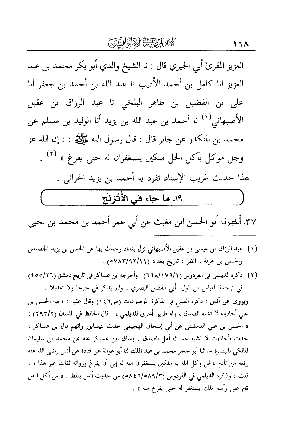 37- أَخْبَرَنَا أَبُو الْحَسَنِ بْنُ مُغِيثٍ عَنْ أَبِي عُمَرَ أَحْمَدَ بْنِ مُحَمَّدِ بْنِ يَحْيَى -[169]- عَنْ أَبِيهِ قَالَ: نا أَبُو الْقَاسِمِ أَحْمَدُ بْنُ مُحمَّدِ بْنِ يُوسُفَ قَالَ: نا أَحْمَدُ بْنُ سَهْلٍ الْبَصْرِيُّ الْعَطَّارُ بِالأَسْكَنْدَرِيَّةِ قَالَ: نا عَبْدُ اللَّهِ بْنُ مُحَمَّدٍ الْمَقْدِسِيُّ قَالَ: نا هِشَامُ بْنُ عَمَّارٍ قَالَ: نا بَقِيَّةُ بْنُ الْوَلِيدِ قَالَ: نا أبو سفيان بن عَبْدُ اللَّهِ عَنْ حَبِيبِ بْنِ عَبْدِ اللَّهِ بْنِ أَبِي كَبْشَةَ الأَنْمَارِيِّ عَنْ أَبِيهِ عَنْ جَدِّهِ قَالَ: كَانَ رَسُولُ اللَّهِ صَلَّى اللَّهُ عَلَيْهِ وَسَلَّمَ -[170]- يُعْجِبُهُ النَّظَرُ إِلَى الأُتْرُنْجِ وَالنَّظَرُ إِلَى الْحَمَامِ الأَحْمَرِ.