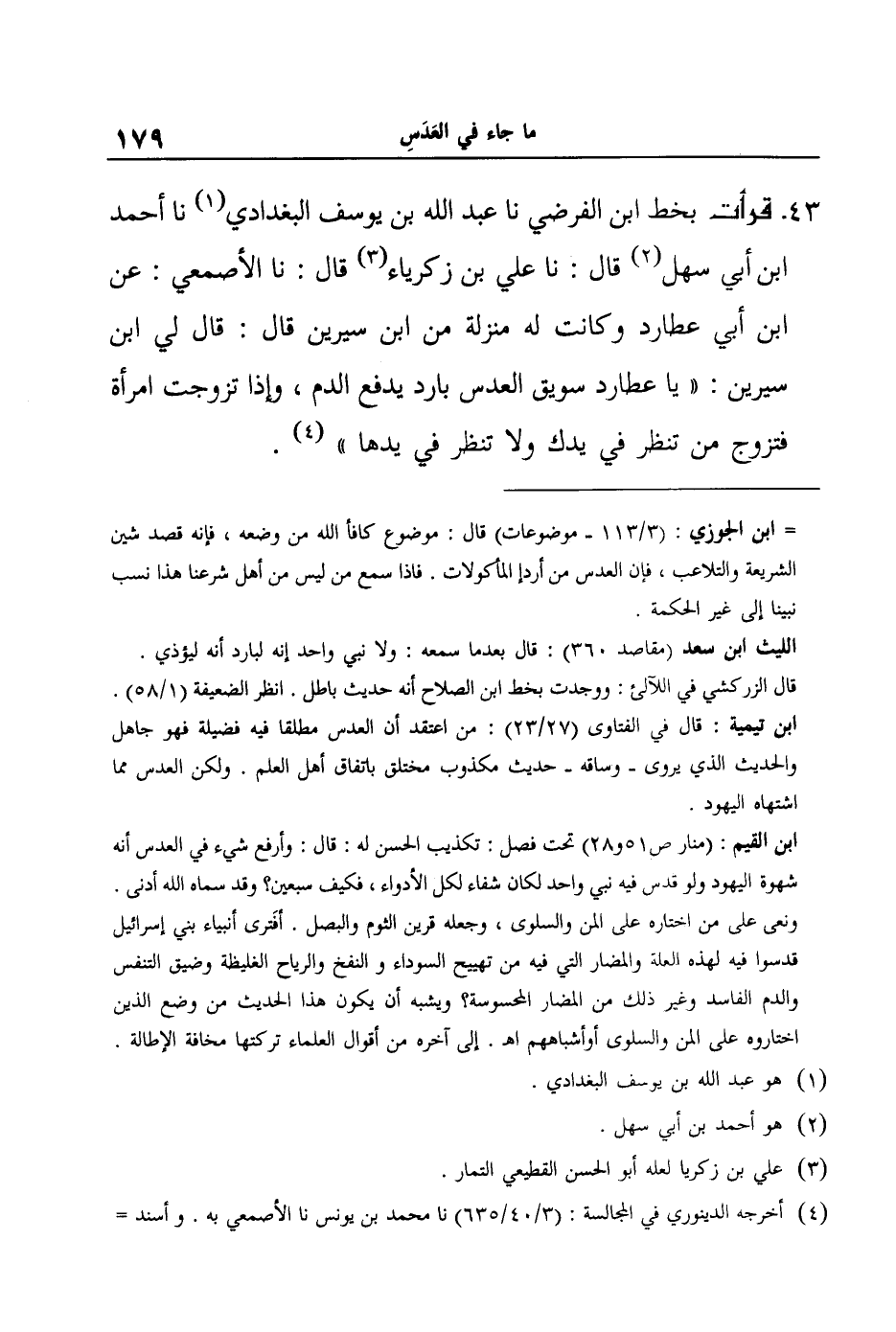 43- قَرَأْتُ بِخَطِّ ابْنِ الْفَرَضِيِّ نا عَبْدُ اللَّهِ بْنُ يُوسُفَ الْبَغْدَادِيُّ نا أَحْمَدُ بْنُ أَبِي سَهْلٍ قَالَ: نا عَلِيُّ بْنُ زَكَرِيَّاءَ قَالَ: نا الأَصْمَعِيُّ: عَنِ ابْنِ أَبِي عُطَارِدٍ وَكَانَتْ لَهُ مَنْزِلَةٌ مِنَ ابْنِ سِيرِينَ قَالَ: قَالَ لِي ابْنُ سِيرِينَ: "يَا عُطَارِدُ سَوِيقُ الْعَدَسِ بَارِدٌ يَدْفَعُ الدَّمَ، وَإِذَا تَزَوَّجْتَ امْرَأَةً فَتَزَوَّجْ مَنْ تَنْظُرُ فِي يَدِكَ وَلا تَنْظُرُ فِي يَدِهَا".