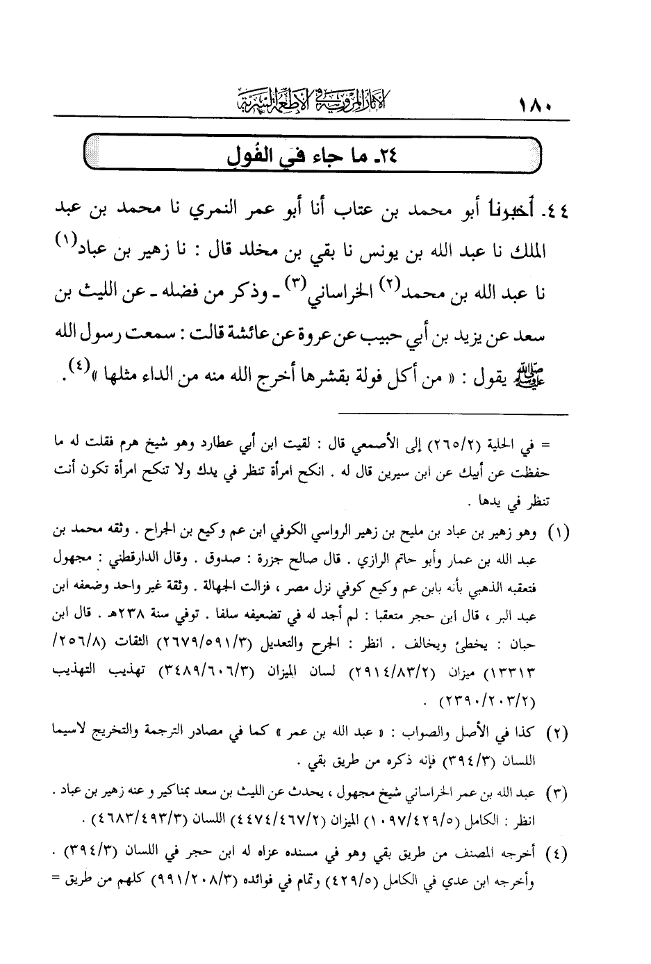 44- أَخْبَرَنَا أَبُو مُحَمَّدِ بْنُ عَتَّابٍ أنا أَبُو عُمَرَ النَّمَرِيُّ نا مُحَمَّدُ بْنُ عَبْدِ الْمَلِكِ نا عَبْدُ اللَّهِ بْنُ يُونُسَ نا بَقِيُّ بْنُ مَخْلَدٍ قَالَ: نا زُهَيْرُ بْنُ عَبَّادٍ نا عَبْدُ اللَّهِ بن محمد الخراساني - وَذَكَرَ مِنْ فَضْلِهِ - عَنِ اللَّيْثِ بْنِ سَعْدٍ عَنْ يَزِيدَ بْنِ أَبِي حَبِيبٍ عَنْ عُرْوَةَ عَنْ عائشة قالت: سَمِعْتُ رَسُولَ اللَّهِ صَلَّى اللَّهُ عَلَيْهِ وَسَلَّمَ يَقُولُ: "مَنْ أَكَلَ فُولَةً بِقِشْرِهَا أَخْرَجَ اللَّهُ مِنْهُ مِنَ الدَّاءِ مِثْلَهَا".