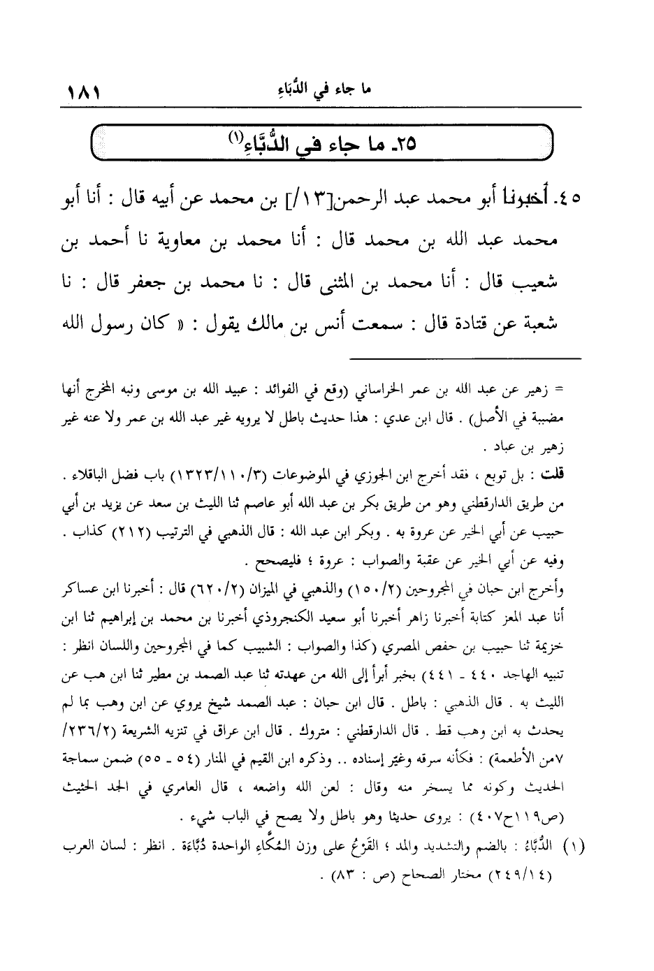 45- أَخْبَرَنَا أَبُو مُحَمَّدٍ عَبْدُ الرَّحْمَنِ بْنُ مُحَمَّدٍ عَنْ أَبِيهِ قَالَ: أنا أَبُو مُحَمَّدٍ عَبْدُ اللَّهِ بْنُ مُحَمَّدٍ قَالَ: أنا مُحَمَّدُ بْنُ مُعَاوِيَةَ نا أَحْمَدُ بْنُ شُعَيْبٍ قَالَ: أنا مُحَمَّدُ بْنُ الْمُثَنَّى قَالَ: نا مُحَمَّدُ بْنُ جَعْفَرٍ قَالَ: نا شُعْبَةُ عَنْ قَتَادَةَ قَالَ: سَمِعْتُ أَنَسَ بْنَ مَالِكٍ يَقُولُ: "كَانَ رَسُولُ اللَّهِ -[182]- صَلَّى اللَّهُ عَلَيْهِ وَسَلَّمَ يُحِبُّ الدُّبَّاءَ".