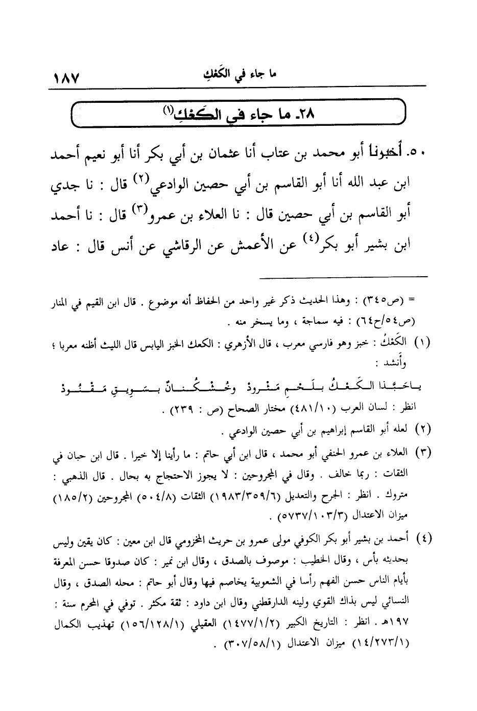 50- أَخْبَرَنَا أَبُو مُحَمَّدِ بْنُ عَتَّابٍ أنا عُثْمَانُ بْنُ أَبِي بَكْرٍ أنا أَبُو نُعَيْمٍ أَحْمَدُ بْنُ عَبْدِ اللَّهِ أنا أَبُو الْقَاسِمُ بْنُ أَبِي حُصَيْنٍ الْوَادِعِيُّ قَالَ: نا جَدِّي أَبُو الْقَاسِمِ بْنُ أَبِي حُصَيْنٍ قَالَ: نا الْعَلاءُ بْنُ عَمْرٍو قَالَ: نا أَحْمَدُ بْنُ بَشِيرٍ أَبُو بَكْرٍ عَنِ الأَعْمَشِ عَنِ الرَّقَاشِيِّ عَنْ أَنَسٍ قَالَ: عَادَ -[188]- النَّبِيُّ صَلَّى اللَّهُ عَلَيْهِ وَسَلَّمَ مَرِيضًا فَقَالَ لَهُ: "تَشْتَهِي كَعْكًا؟ " زَادَ غَيْرُهُ قَالَ: "نَعَمْ"، فَطَلَبَهُ لَهُ.
