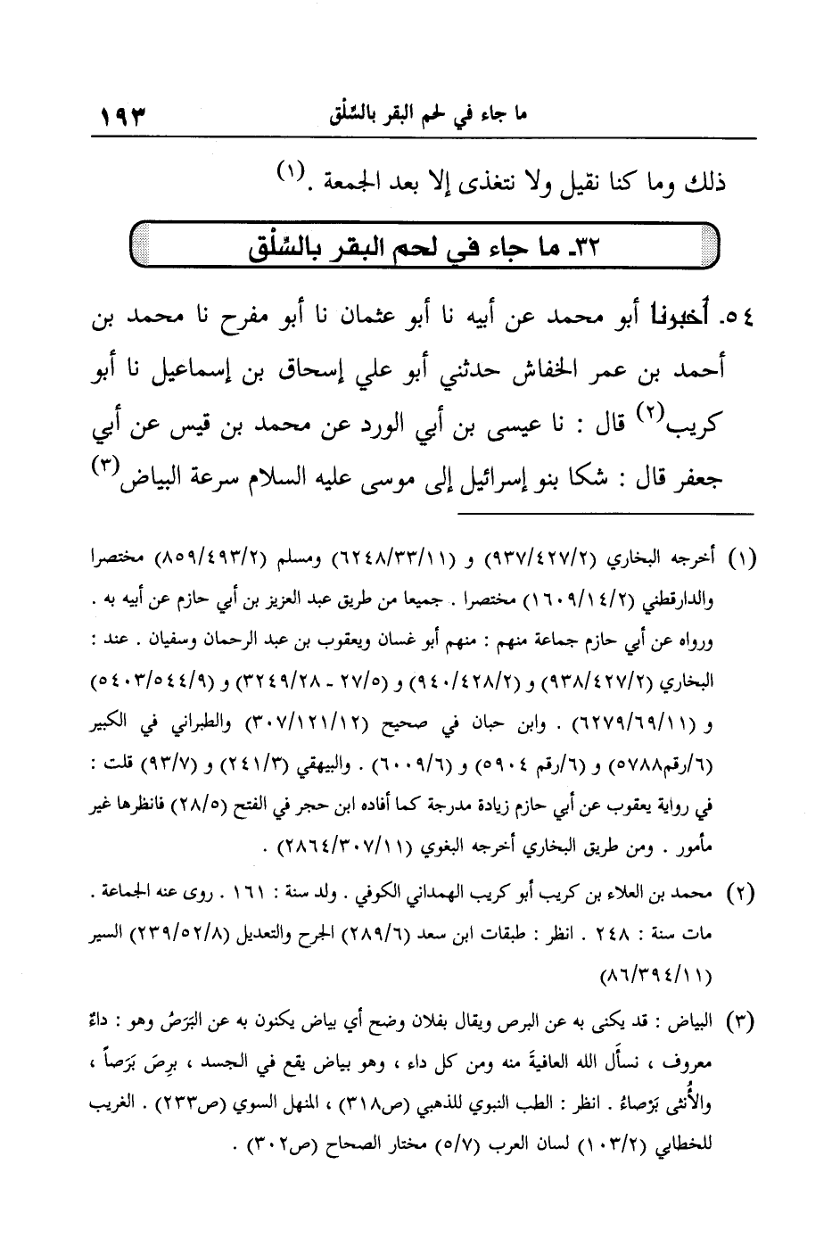 54- أَخْبَرَنَا أَبُو مُحَمَّدٍ عَنْ أَبِيهِ نا أَبُو عُثْمَانَ نا أَبُو مفرحٍ نا مُحَمَّدُ بْنُ أَحْمَدَ بْنِ عُمَرَ الْخَفَّاشُ حَدَّثَنِي أَبُو عَلِيٍّ إِسْحَاقُ بْنُ إِسْمَاعِيلَ نا أَبُو كُرَيْبٍ قَالَ: نا عِيسَى بْنُ أَبِي الْوَرْدِ عَنْ مُحَمَّدِ بْنِ قَيْسٍ عَنْ أَبِي جَعْفَرٍ قَالَ: شَكَا بَنُو إِسْرَائِيلَ إِلَى مُوسَى عَلَيْهِ السَّلامُ سُرْعَةَ الْبَيَاضِ -[194]- فِيهِمْ فَدَعَا مُوسَى رَبَّهُ فَأَوْحَى اللَّهُ إِلَيْهِ أَنْ يَأْكُلُوا لَحْمَ الْبَقَرِ بِالسِّلْقِ.