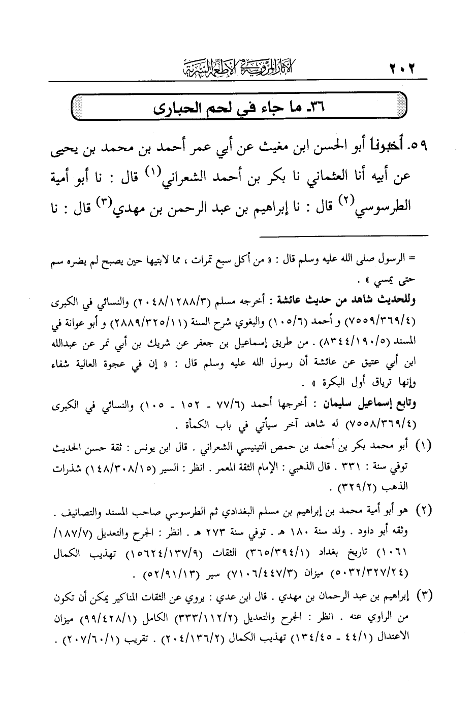 59- أَخْبَرَنَا أَبُو الْحَسَنِ بْنُ مُغِيثٍ عَنْ أَبِي عُمَرَ أَحْمَدَ بْنِ مُحَمَّدِ بْنِ يَحْيَى عَنْ أَبِيهِ أنا الْعُثْمَانِيُّ نا بَكْرُ بْنُ أَحْمَدَ الشَّعْرَانِيُّ قَالَ: نا أَبُو أُمَيَّةَ الطَّرَسُوسِيُّ قَالَ: نا إِبْرَاهِيمُ بْنُ عَبْدِ الرَّحْمَنِ بْنِ مَهْدِيٍّ قَالَ: نا -[203]- إِبْرَاهِيمُ بْنُ عُمَرَ عن سَفِينَةَ عَنْ أَبِيهِ عَنْ سَفِينَةَ قَالَ: "أَكَلْتُ مَعَ النَّبِيِّ صَلَّى اللَّهُ عَلَيْهِ وَسَلَّمَ لَحْمَ حُبَارَى".