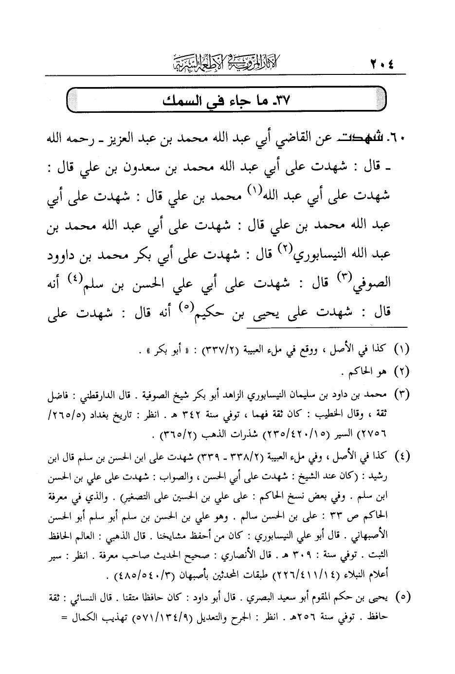 60- شَهِدْتُ عَنِ الْقَاضِي أَبِي عَبْدِ اللَّهِ مُحَمَّدِ بْنِ عَبْدِ الْعَزِيزِ - رَحِمَهُ اللَّهُ - قَالَ: شَهِدْتُ عَلَى أَبِي عَبْدِ اللَّهِ مُحَمَّدِ بْنِ سَعْدُونِ بْنِ عَلِيٍّ قَالَ: شَهِدْتُ عَلَى أَبِي عَبْدِ اللَّهِ مُحَمَّدِ بْنِ عَلِيٍّ قَالَ: شَهِدْتُ عَلَى أَبِي عَبْدِ اللَّهِ مُحَمَّدِ بْنِ عَلِيٍّ قَالَ: شَهِدْتُ عَلَى أَبِي عَبْدِ اللَّهِ مُحَمَّدِ بْنِ عَبْدِ اللَّهِ النَّيْسَابُورِيِّ قَالَ: شَهِدْتُ عَلَى أَبِي بكر محمد بن داوود الصُّوفِيِّ قَالَ: شَهِدْتُ عَلَى أَبِي عَلِيٍّ الْحَسَنِ بْنِ سَلْمٍ أَنَّهُ قَالَ: شَهِدْتُ عَلَى يَحْيَى بْنِ حَكِيمٍ أَنَّهُ قَالَ: شَهِدْتُ عَلَى -[205]- أَبِي قُتَيْبَةَ أَنَّهُ قَالَ: شَهِدْتُ عَلَى زُهَيْرِ بْنِ خَيْثَمَةَ أَنَّهُ قَالَ: شَهِدْتُ عَلَى عَبْدِ الْمَلِكِ بْنِ أَبِي بِشْرٍ قَالَ: شَهِدْتُ عَلَى عِكْرِمَةَ قَالَ: شَهِدْتُ عَلَى ابْنِ عَبَّاسٍ أَنَّهُ قَالَ: شَهِدْتُ عَلَى أَبِي بَكْرٍ الصِّدِّيقِ أَنَّهُ قَالَ: "كُلِ السَّمَكَ الطَّافِينَ".