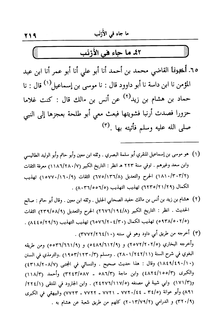 65- أَخْبَرَنَا الْقَاضِي مُحَمَّدُ بْنُ أَحْمَدَ أنا أَبُو عَلِيٍّ أنا أَبُو عُمَرَ أنا ابْنُ عَبْدِ الْمُؤْمِنِ نا ابن داسة نا أبو داوود قَالَ: نا مُوسَى بْنُ إِسْمَاعِيلَ قَالَ: نا حَمَّادُ بْنُ هِشَامِ بْنِ زَيْدٍ عَنْ أَنَسِ بْنِ مَالِكٍ قَالَ: كُنْتُ غُلامًا حَزَوَّرًا فصدت أرنبا فشويتها فَبَعَثَ مَعِي أَبُو طَلْحَةَ بَعَجُزِهَا إِلَى النَّبِيِّ صَلَّى اللَّهُ عَلَيْهِ وَسَلَّمَ فَأَتَيْتُهُ بِهَا.