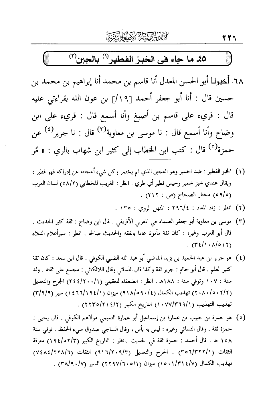 68- أَخْبَرَنَا أَبُو الْحَسَنِ الْمُعَدَّلُ أنا قَاسِمُ بْنُ مُحَمَّدٍ أنا إِبْرَاهِيمُ بْنُ مُحَمَّدِ بْنِ حُسَيْنٍ قَالَ: أنا أَبُو جَعْفَرٍ أَحْمَدُ بْنُ عَوْنِ اللَّهِ بِقِرَاءَتِي عَلَيْهِ قَالَ: قُرِئَ عَلَى قَاسِمِ بْنِ أَصْبَغَ وَأَنَا أَسْمَعُ قَالَ: قُرِئَ عَلَى ابْنِ وَضَّاحٍ وَأَنَا أَسْمَعُ قَالَ: نا مُوسَى بْنُ مُعَاوِيَةَ قَالَ: نا جَرِيرٌ عَنْ حَمْزَةَ قَالَ: كَتَبَ ابْنُ الْخَطَّابِ إِلَى كَثِيرِ بْنِ شِهَابٍ بِالرَّيِّ: "مُر -[227]- مَن قِبَلَكَ مِنَ الْمُسْلِمِينَ أَنْ يَأْكُلُوا الخبزَ الفطيرَ بالجُبن؛ فَإِنَّهُ أَبْقَى فِي الجَوْفِ".