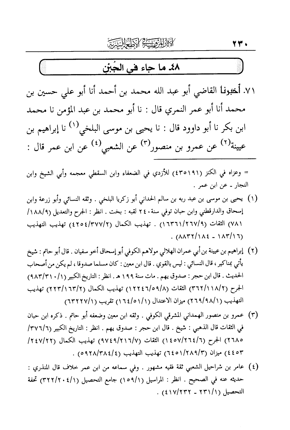71- أَخْبَرَنَا الْقَاضِي أَبُو عَبْدِ اللَّهِ مُحَمَّدُ بْنُ أَحْمَدَ أنا أَبُو عَلِيٍّ حُسَيْنُ بْنُ مُحَمَّدٍ أنا أَبُو عُمَرَ النَّمَرِيُّ قَالَ: نا أَبُو مُحَمَّدِ بْنُ عَبْدِ الْمُؤْمِنِ نا مُحَمَّدُ بْنُ بَكْرٍ نا أَبُو داوود قَالَ: نا يَحْيَى بْنُ مُوسَى الْبَلْخِيُّ نا إِبْرَاهِيمُ بْنُ عُيَيْنَةَ عَنْ عَمْرِو بْنِ مَنْصُورٍ عَنِ الشَّعْبِيِّ عَنِ ابْنِ عُمَرَ قَالَ: -[231]- أُتِيَ النَّبِيُّ صَلَّى اللَّهُ عَلَيْهِ وَسَلَّمَ بِجُبْنَةٍ فِي تَبُوكَ فَدَعَا بِسِكِّينَ فَسَمَّى وَقَطَعَ.