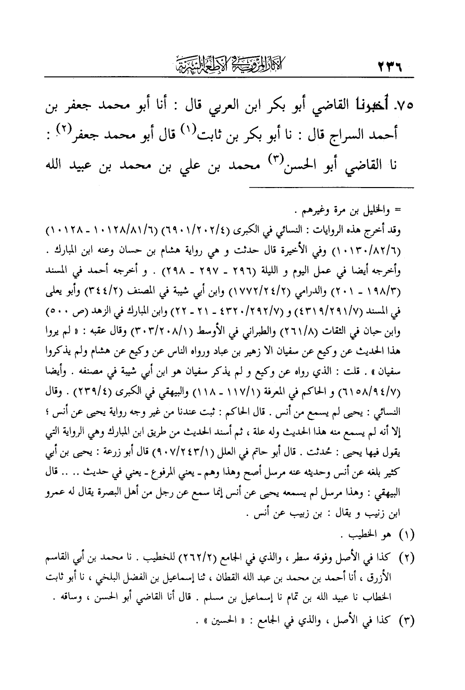 75- أَخْبَرَنَا الْقَاضِي أَبُو بَكْرٍ ابْنُ الْعَرَبِيِّ قَالَ: أنا أَبُو مُحَمَّدٍ جَعْفَرُ بْنُ أَحْمَدَ السَّرَّاجُ قَالَ: نا أَبُو بَكْرِ بْنُ ثَابِتٍ قَالَ أَبُو مُحَمَّدٍ جَعْفَرٌ: نا الْقَاضِي أَبُو الْحَسَنِ مُحَمَّدُ بْنُ عَلِيِّ بْنِ مُحَمَّدِ بْنِ عُبَيْدِ اللَّهِ -[237]- الْهَاشِمِيُّ الْخَطِيبُ قَالَ: أنا عَلِيُّ بْنُ مُحَمَّدٍ الْحَرْبِيُّ قَالَ: نا أَبُو بَكْرٍ مُحَمَّدُ بْنُ هَارُونَ الْمَالِكِيُّ قَالَ: نا الْحُسَيْنُ بْنُ أَبِي زَيْدٍ الدَّبَّاغُ قَالَ: نا عُبَيْدُ اللَّهِ بْنُ تَمَّامٍ السُّلَمِيُّ عَنْ إِسْمَاعِيلَ بْنِ مُسْلِمٍ الْمَكِّيُّ: عَنِ الزُّهْرِيِّ قَالَ: مَنْ سَرَّهُ - وَقَالَ الْهَاشِمِيُّ: مَنْ أَحَبَّ - أَنْ يَحْفَظَ الْحَدِيثَ فَلْيَأْكُلِ الزَّبِيبَ.