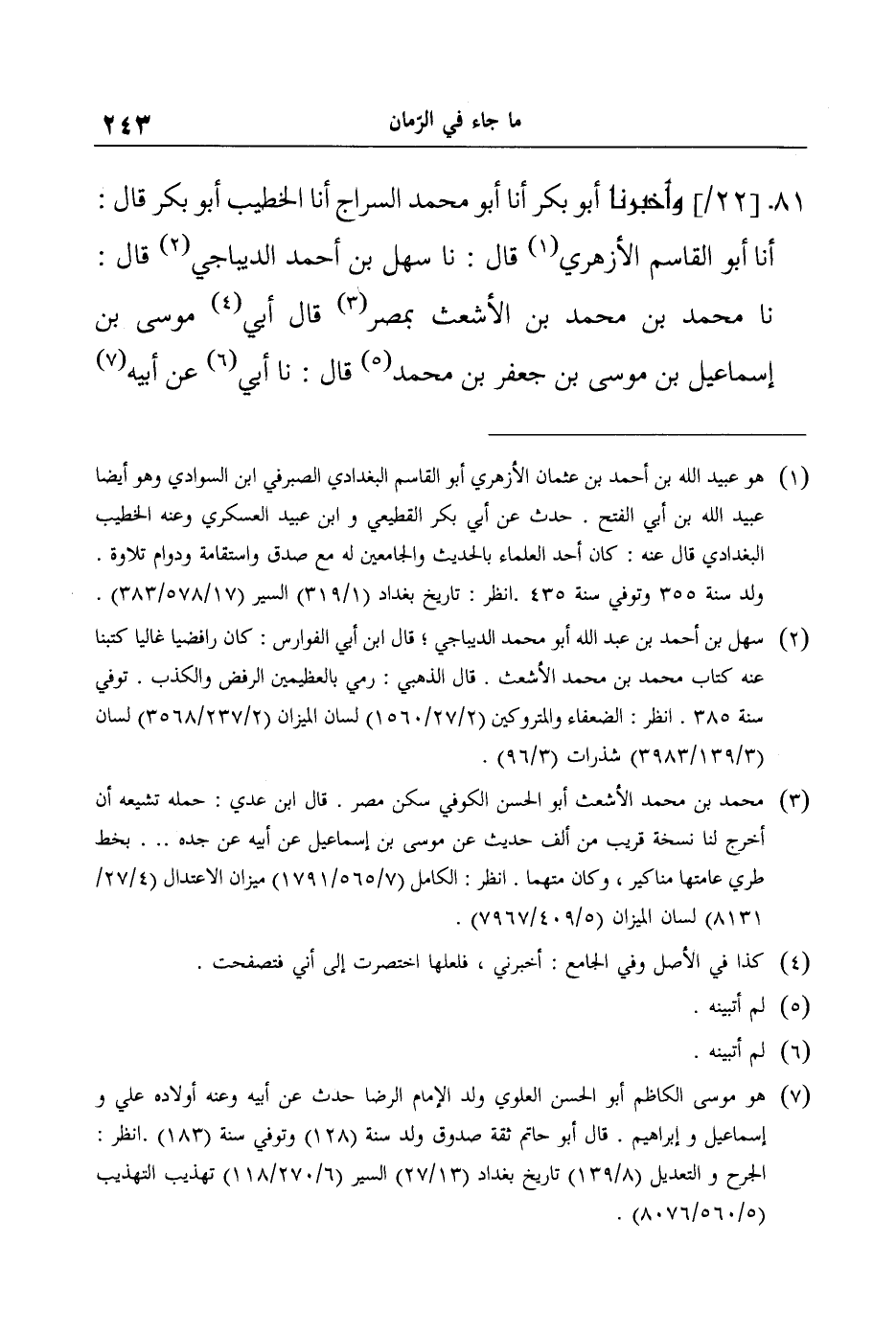 81- وَأَخْبَرَنَا أَبُو بَكْرٍ أنا أَبُو مُحَمَّدٍ السَّرَّاجُ أنا الْخَطِيبُ أَبُو بَكْرٍ قَالَ: أنا أَبُو الْقَاسِمِ الأَزْهَرِيُّ قَالَ: نا سَهْلُ بْنُ أَحْمَدَ الدِّيبَاجِيُّ قَالَ: نا مُحَمَّدُ بْنُ مُحَمَّدِ بْنِ الأَشْعَثِ بِمِصْرَ قَالَ أَبِي مُوسَى بْنُ إِسْمَاعِيلَ بْنِ مُوسَى بْنِ جَعْفَرِ بْنِ مُحَمَّدٍ قَالَ: نا أَبِي عَنْ أَبِيهِ -[244]- عَنْ جَدِّهِ جَعْفَرِ بْنِ مُحَمَّدٍ عَنْ أَبِيهِ: أَنَّ عَلِيًّا رَضِيَ اللَّهُ عَنْهُ قَالَ: عَلَيْكُمْ بِالرُّمَّانِ الْحُلْوِ، فَإِنَّهُ نَصُوحُ الْمَعِدَةِ.
