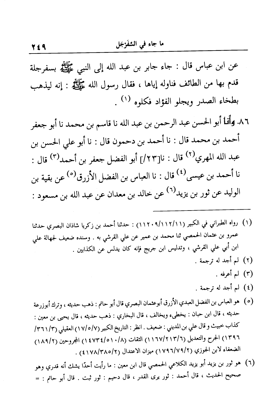86- وأنا أَبُو الْحَسَنِ عَبْدُ الرَّحْمَنِ بْنُ عَبْدِ اللَّهِ نا قَاسِمُ بْنُ مُحَمَّدِ نا أَبُو جَعْفَرٍ أَحْمَدُ بْنُ مُحَمَّدٍ قَالَ: نا أَحْمَدُ بْنُ دحمون قَالَ: نا أَبُو عَلِيٍّ الْحَسَنُ بْنُ عَبْدِ اللَّهِ الْمَهْرِيُّ قَالَ: نا أَبُو الْفَضْلِ جَعْفَرُ بْنُ أَحْمَدَ قَالَ: نا أَحْمَدُ بْنُ عِيسَى قَالَ: نا الْعَبَّاسُ بْنُ الْفَضْلِ الأَزْرَقُ عَنْ بَقِيَّةَ بْنِ الْوَلِيدِ عَنْ ثَوْرِ بْنِ يَزِيدَ عَنْ خَالِدِ بْنِ مَعْدَانَ عَنْ عَبْدِ اللَّهِ بْنِ مَسْعُودٍ: -[250]- عَنِ النَّبِيِّ صَلَّى اللَّهُ عَلَيْهِ وَسَلَّمَ قَالَ: "أَطْعِمُوا حُبَالاكُمُ السَّفَرْجَلَ".