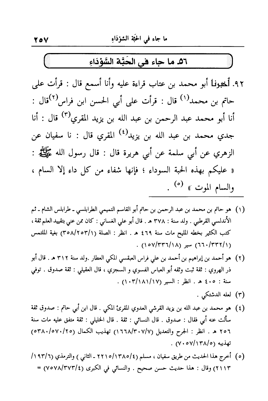92- أَخْبَرَنَا أَبُو مُحَمَّدِ بْنُ عَتَّابٍ قِرَاءَةً عَلَيْهِ وَأَنَا أَسْمَعُ قَالَ: قَرَأْتُ عَلَى حَاتِمِ بْنِ مُحَمَّدٍ قَالَ: قَرَأْتُ عَلَى أَبِي الْحَسَنِ بْنِ فِرَاسٍ قَالَ: أنا أَبُو مُحَمَّدٍ عَبْدُ الرَّحْمَنِ بْنُ عَبْدِ اللَّهِ بْنِ يَزِيدَ الْمُقْرِي قَالَ: أنا جَدِّي مُحَمَّدُ بْنُ عَبْدِ اللَّهِ بْنِ يَزِيدَ الْمُقْرِي قَالَ: نا سُفْيَانُ عَنِ الزُّهْرِيِّ عَنْ أَبِي سَلَمَةَ عَنْ أَبِي هُرَيْرَةَ قَالَ: قَالَ رَسُولُ اللَّهِ صَلَّى اللَّهُ عَلَيْهِ وَسَلَّمَ: "عَلَيْكُمْ بِهَذِهِ الْحَبَّةِ السَّوْدَاءِ؛ فَإِنَّهَا شِفَاءٌ مِنْ كُلِّ دَاءٍ إِلا السَّامَ، وَالسَّامُ الْمَوْتُ".