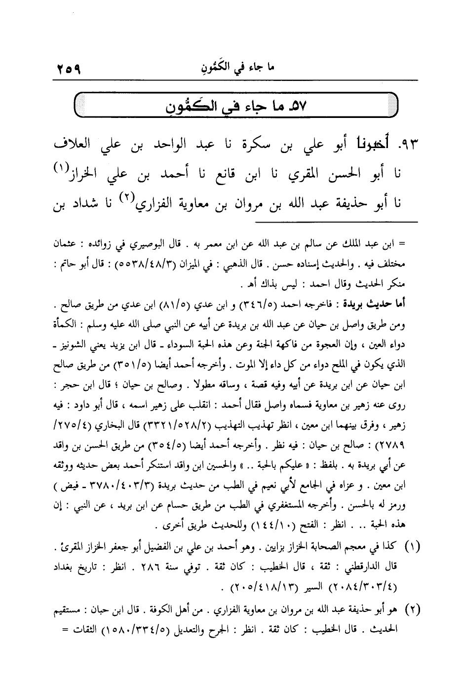 93- أَخْبَرَنَا أَبُو عَلِيِّ بْنُ سكرَةَ نا عَبْدُ الْوَاحِدِ بْنُ عَلِيٍّ الْعَلافُ نا أَبُو الْحَسَنِ الْمُقْرِي نا ابْنُ قَانِعٍ نا أَحْمَدُ بْنُ عَلِيٍّ الْخَرَّازُ نا أَبُو حُذَيْفَةَ عَبْدُ اللَّهِ بْنُ مَرْوَانَ بْنِ مُعَاوِيَةَ الْفَزَارِيُّ نا شَدَّادُ بْنُ -[260]- عَبْدِ الرَّحْمَنِ: نا إِبْرَاهِيمُ بْنُ أَبِي عَبْلَةَ قَالَ: خَرَجْنَا مِنْ عِنْدِ وَاثِلَةَ بْنِ الأَسْقَعِ فَلَقِينَا عَبْدَ اللَّهِ الدَّيْلَمِيَّ فَقَالَ: مِنْ أَيْنَ؟ قُلْنَا مِنْ عِنْدِ وَاثِلَةَ بْنِ الأَسْقَعِ قَالَ: فَأَيْنَ تُرِيدُونَ؟ ، قُلْنَا: أَرَدْنَا أَبَا أُبَي الأَنْصَارِيَّ، قَالَ: عَلَيْكُمُ الرَّجُلُ فَدَخَلْنَا عَلَى أَبِي أُبَيٍّ قَالَ أَبُو أُبَي: قَالَ رَسُولُ اللَّهِ صَلَّى اللَّهُ عَلَيْهِ وَسَلَّمَ: "السَّمْنُ وَالسَّنُّوتُ فِيهِمَا دَوَاءٌ وَشِفَاءٌ مِنْ كُلِّ دَاءٍ".