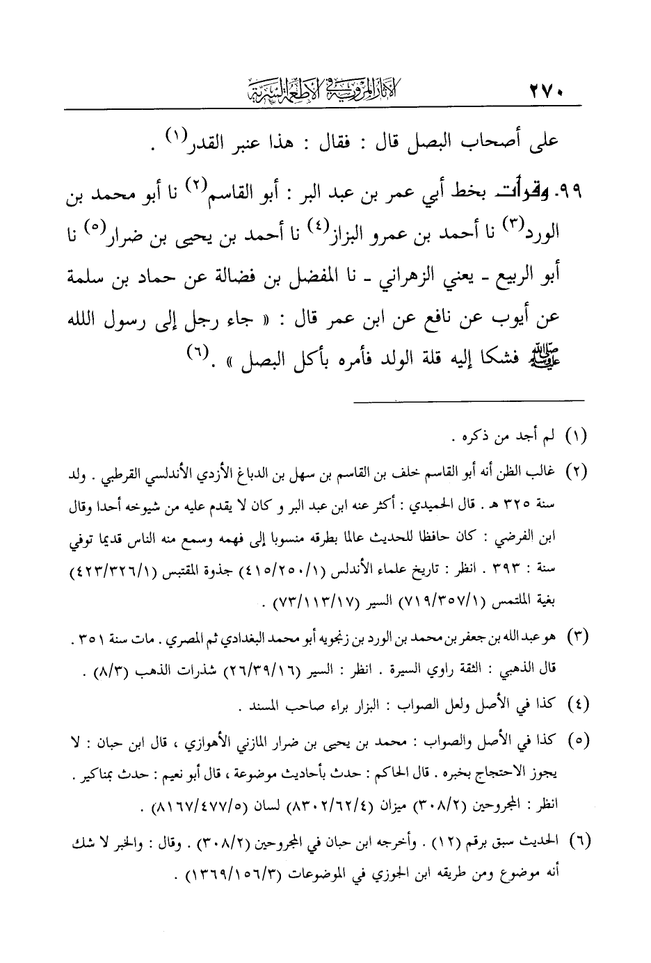 99- وَقَرَأْتُ بِخَطِّ أَبِي عُمَرَ بْنِ عَبْدِ الْبَرِّ: أَبُو الْقَاسِمِ نا أَبُو مُحَمَّدِ بْنُ الْوَرْدِ نا أَحْمَدُ بْنُ عَمْرٍو الْبَزَّارُ نا أَحْمَدُ بْنُ يَحْيَى بْنِ ضِرَارٍ نا أَبُو الرَّبِيعِ - يَعْنِي الزَّهْرَانِيَّ - نا الْمُفَضَّلُ بْنُ فَضَالَةَ عَنْ حَمَّادِ بْنِ سَلَمَةَ عَنْ أَيُّوبَ عَنْ نَافِعٍ عَنِ ابْنِ عُمَرَ قَالَ: "جَاءَ رَجُلٌ إِلَى رَسُولِ اللَّهِ صَلَّى اللَّهُ عَلَيْهِ وَسَلَّمَ فَشَكَا إِلَيْهِ قِلَّةَ الْوَلَدِ فَأَمَرَهُ بِأَكْلِ الْبَصَلِ".