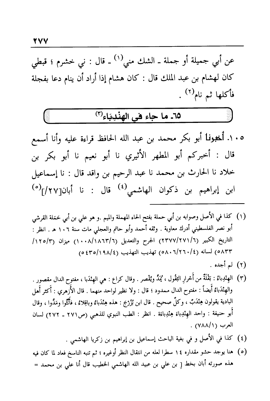 105- أَخْبَرَنَا أَبُو بَكْرٍ مُحَمَّدُ بْنُ عَبْدِ اللَّهِ الْحَافِظُ قِرَاءَةً عَلَيْهِ وَأَنَا أَسْمَعُ قَالَ: أَخْبَرَكُمْ أَبُو الْمُطَهَّرِ الأَثِيرِيُّ نا أَبُو نُعَيْمٍ نا أَبُو بَكْرِ بْنُ خَلادٍ نا الْحَارِثِ بْنِ مُحَمَّدٍ نا عَبْدُ الرَّحِيمِ بْنُ وَاقِدٍ قَالَ: نا إِسْمَاعِيلُ بْنُ إِبْرَاهِيمَ بْنِ ذَكْوَانَ الْهَاشِمِيُّ قَالَ: نا أَبَانٌ -[278]- الْمُحَبَّرُ عَنْ أَبَانِ بْنِ أَبِي عَيَّاشٍ عَنْ أَنَسِ بْنِ مَالِكٍ قَالَ: قَالَ رَسُولُ اللَّهِ صَلَّى اللَّهُ عَلَيْهِ وَسَلَّمَ: "كُلُوا الْهِنْدِبَاءَ وَلا تَنْفُضُوهُ؛ فَإِنَّهُ لَيْسَ يَوْمٌ مِنَ الأَيَّامِ إِلا وَقَطَرَاتٌ مِنَ الْجَنَّةِ يَقْطُرُ عَلَيْهِ".