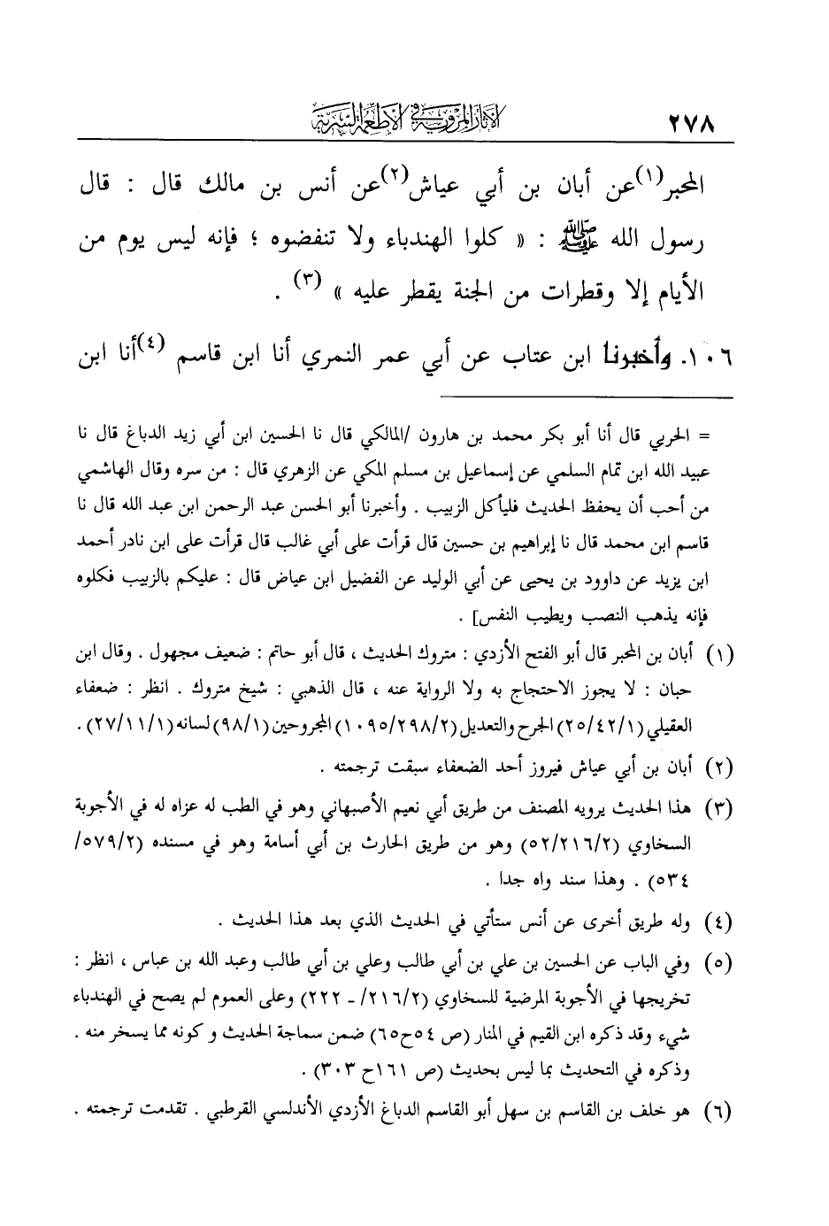 106- وَأَخْبَرَنَا ابْنُ عَتَّابٍ عَنْ أَبِي عُمَرَ النَّمَرِيِّ أنا ابْنُ قَاسِمٍ أنا ابْنُ -[279]- الْوَرْدِ نا أَبُو يَزِيدَ نا أَسَدُ بْنُ مُوسَى قَالَ: نا إِسْمَاعِيلُ بْنُ سَعِيدٍ النَّصْرِيُّ عَنْ مُحَمَّدِ بْنِ الْحَارِثِ عَنْ مُحَمَّدِ بْنِ أَيُّوبَ عَنْ رَجُلٍ مِنْ وَلَدِ جَعْفَرِ بْنِ أَبِي طَالِبٍ قَالَ: كَانَ رَسُولُ اللَّهِ صَلَّى اللَّهُ عَلَيْهِ وَسَلَّمَ يُسْتَحَبُّ الْهِنْدِبَا بِالْخَلِّ.