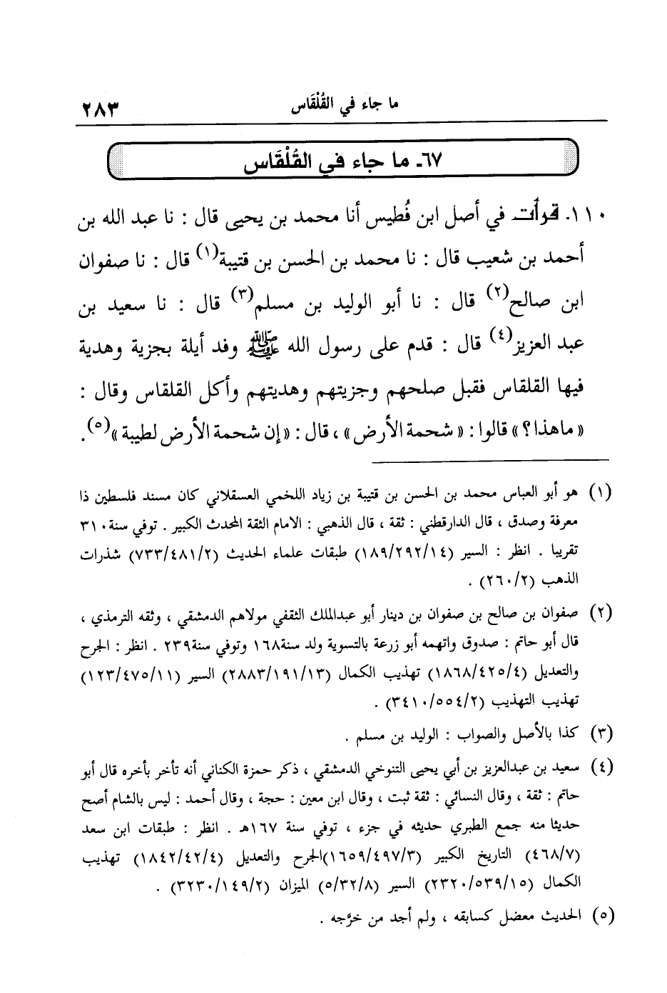 110- قَرَأْتُ فِي أَصْلِ ابْنِ فُطيس أنا مُحَمَّدُ بْنُ يَحْيَى قَالَ: نا عَبْدُ اللَّهِ بْنُ أَحْمَدَ بْنِ شُعَيْبٍ قَالَ: نا مُحَمَّدُ بْنُ الْحَسَنِ بْنِ قُتَيْبَةَ قَالَ: نا صَفْوَانُ بْنُ صَالِحٍ قَالَ: نا أَبُو الْوَلِيدُ بْنُ مُسْلِمٍ قَالَ: نا سَعِيدُ بْنُ عَبْدِ الْعَزِيزِ قَالَ: قَدِمَ عَلَى رَسُولِ اللَّهِ صَلَّى اللَّهُ عَلَيْهِ وَسَلَّمَ وَفْدُ أَيْلَةَ بِجِزْيَةٍ وَهَدِيَّةٍ فِيهَا الْقُلْقَاسُ فَقَبِلَ صُلْحَهُمْ وَجِزْيَتَهُمْ وَهَدِيَّتَهُمْ وَأَكَلَ الْقُلْقَاسَ وَقَالَ: "مَا هَذَا؟ " قَالُوا: "شَحْمَةُ الأَرْضِ"، قَالَ: "إِنَّ شَحْمَةَ الْأَرْضِ لَطَيِّبَةٌ".