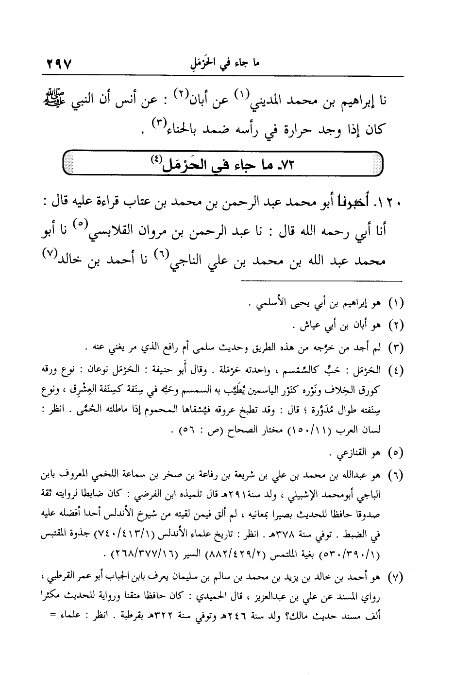 120- أَخْبَرَنَا أَبُو مُحَمَّدٍ عَبْدُ الرَّحْمَنِ بْنُ مُحَمَّدِ بْنُ عَتَّابٍ قِرَاءَةً عَلَيْهِ قَالَ: أنا أَبِي رَحِمَهُ اللَّهُ قَالَ: نا عَبْدُ الرَّحْمَنِ بْنُ مروان القلابسي نا أَبُو مُحَمَّدٍ عَبْدُ اللَّهِ بْنُ مُحَمَّدِ بْنِ عَلِيٍّ النَّاجِيُّ نا أَحْمَدُ بْنُ خَالِدٍ -[298]- نا إِبْرَاهِيمُ بْنُ مُحَمَّدٍ نا عَوْنُ بْنُ يُوسُفَ عَنْ عَبْدِ اللَّهِ بْنِ عُمَرَ بْنِ غَانِمٍ قَالَ: ني إِسْمَاعِيلُ بْنُ عَيَّاشٍ الْحِمْصِيُّ عَنْ بَعْضِ الْقُرَشِيِّينَ عَنْ يَزِيدَ بْنِ أَبِي حَبِيبٍ عَنْ عَبْدِ اللَّهِ بْنِ عُمَرَ بْنِ الْخَطَّابِ قَالَ: قَالَ رَسُولُ اللَّهِ صَلَّى اللَّهُ عَلَيْهِ وَسَلَّمَ: "وَالَّذِي نَفْسِي بِيَدِهِ مَا يَنْبُتُ عِرْقٌ مِنْ حَرْمَلٍ وَلا أَصْلٌ وَلا فَرْعٌ وَلا وَرَقَةٌ وَلا زَهْرَةٌ إِلا وَمَلَكٌ مُوَكَّلٌ بِهَا حَتَّى تَصِلُ إِلَى مَنْ وَصَلَتْ إِلَيْهِ وَإِنَّ فِي أَصْلِهَا وَفَرْعِهَا النُّشْرَةَ وَإِنَّ فِي حَبِّهَا الشِّفَاءُ مِنَ اثْنَيْنِ وَسَبْعِينَ دَاءً فَتَبَخَّرُوا بِالْكُنْدُرِ؛ فَإِنَّهَا بَخُورُ كُلِّ شَيْءٍ، وَمَا مِنْ أَهْلِ بَيْتٍ يَتَبَخَّرُونَ بِهِ إِلا نَفَتْ عَنْهُمْ كُلَّ شَيْطَانٍ فَاغِرٍ فاه باسطا يَدَهُ وَإِنَّهَا لَتَنْفِي عَنِ اثْنَيْنِ وَسَبْعِينَ دَارًا حَوْلَهَا كَمَا تَنْفِي عَنْ أَهْلِ تِلْكَ الدَّارِ".