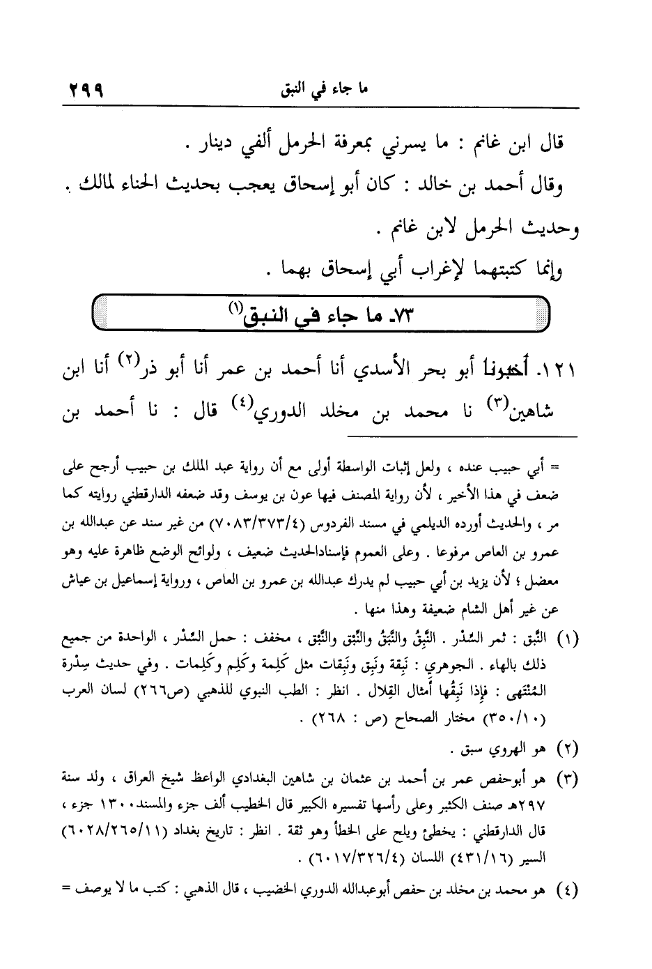 121- أَخْبَرَنَا أَبُو بَحْرٍ الأَسَدِيُّ أنا أَحْمَدُ بْنُ عُمَرَ أنا أَبُو ذَرٍّ أنا ابْنُ شَاهِينَ نا مُحَمَّدُ بْنُ مَخْلَدٍ الدُّورِيُّ قَالَ: نا أَحْمَدُ بْنُ -[300]- الْخَلِيلِ قَالَ: نا الأَصْمَعِيُّ قَالَ: نا عِمْرَانُ بْنُ عُمَرَ الْبَجَلِيُّ عَنْ مُحَمَّدِ بْنِ عَنْتَرٍ الْفَزَارِيِّ عَنِ الشَّعْبِيِّ قَالَ: قَالَ ابْنُ عَبَّاسٍ: "النَّبْقُ شَجَرَةٌ مُبَارَكَةٌ وَهِيَ أَوَّلُ تَمْرَةٍ تُدْرَكُ؛ يَعْنِي مَا أَحَبَّهَا إِلا عَاقِلٌ".