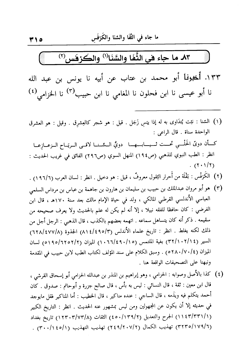 133- أَخْبَرَنَا أَبُو مُحَمَّدِ بْنُ عَتَّابٍ عَنْ أَبِيهِ نا يُونُسُ بْنُ عَبْدِ اللَّهِ نا أَبُو عِيسَى نا ابْنُ فَحْلُونَ نا الْمُغَامِيُّ نا ابْنُ حَبِيبٍ نا الْخُزَامِيُّ -[316]- عَنْ عَبْدِ اللَّهِ بْنِ كَثِيرٍ عَنْ سَلَمَةَ بْنِ دِينَارٍ: عَنْ جَابِرِ بْنِ عَبْدِ اللَّهِ أَنَّ رَسُولَ اللَّهِ صَلَّى اللَّهُ عَلَيْهِ وَسَلَّمَ قَالَ: "عَلَيْكُمْ بِالثَّفَا؛ فَإِنَّهُ لَوْ كَانَ شَيْءٌ يَرُدُّ الْمَوْتَ لَرَدَّهُ الثَّفَاءُ"، وَقَالَ فِي السَّنَا مِثْلَ ذَلِكَ.