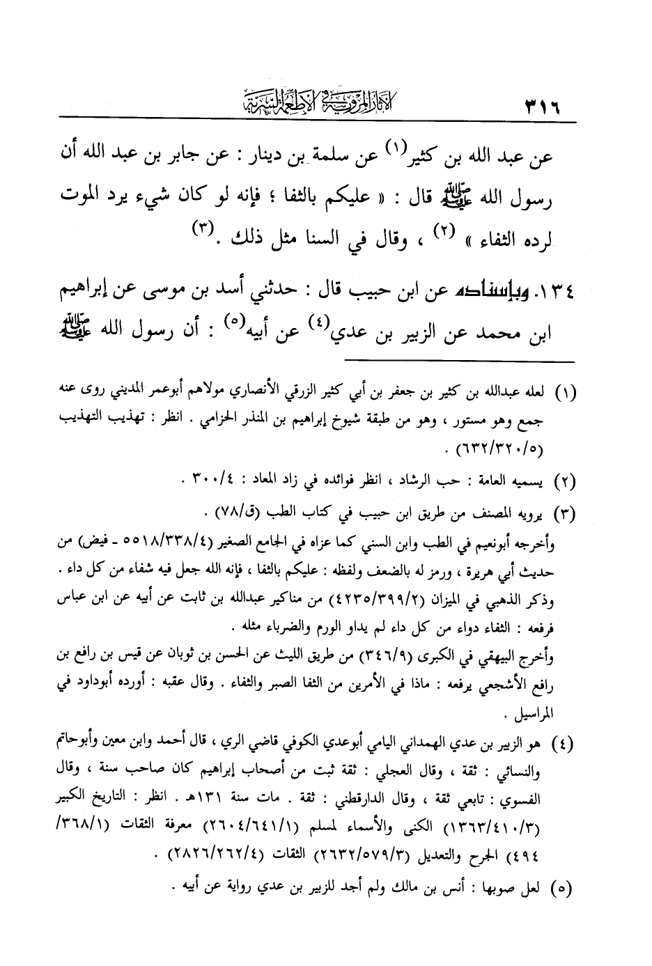 134- وَبِإِسْنَادِهِ عَنِ ابْنِ حَبِيبٍ قَالَ: حَدَّثَنِي أَسَدُ بْنُ مُوسَى عَنْ إِبْرَاهِيمَ بْنِ مُحَمَّدٍ عَنِ الزُّبَيْرِ بْنِ عَدِيٍّ عَنْ أَبِيهِ: أَنَّ رَسُولُ اللَّهِ صَلَّى اللَّهُ عَلَيْهِ وَسَلَّمَ -[317]- تَوَضَّأَ عَلَى الْكُرْفُسِ فَنَالَتْهُ بَرَكَةُ رَسُولِ اللَّهِ صَلَّى اللَّهُ عَلَيْهِ وَسَلَّمَ.