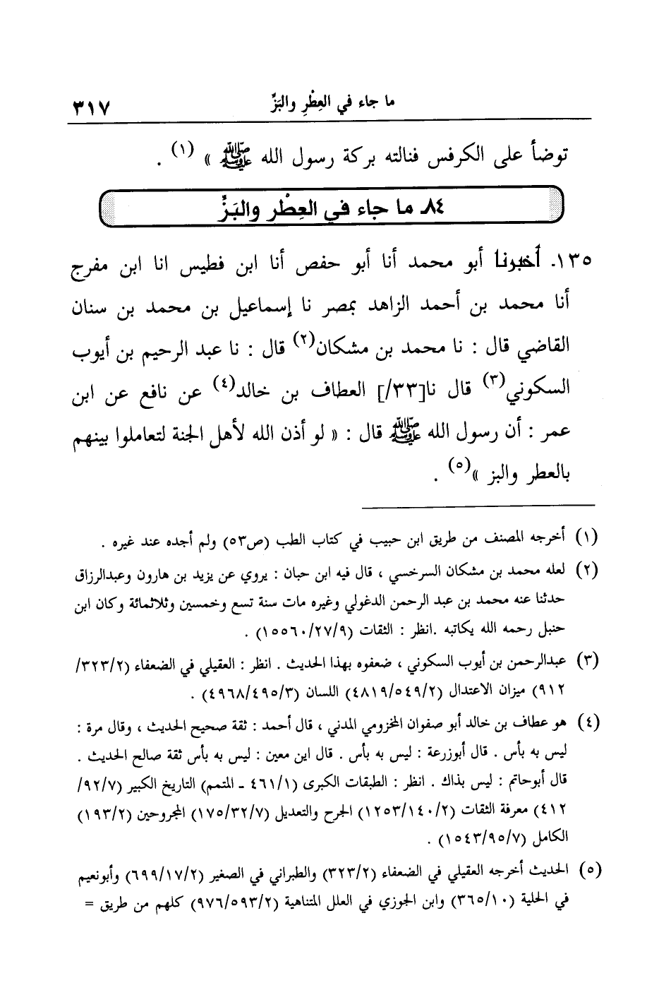 135- أَخْبَرَنَا أَبُو مُحَمَّدٍ أنا أَبُو حَفْصٍ أنا ابْنُ فُطَيْسٍ أنا ابْنُ مُفَرِّجٍ أنا مُحَمَّدُ بْنُ أَحْمَدَ الزَّاهِدُ بِمِصْرَ نا إِسْمَاعِيلُ بْنُ مُحَمَّدِ بْنِ سِنَانٍ الْقَاضِي قَالَ: نا مُحَمَّدُ بْنُ مشْكَانَ قَالَ: نا عَبْدُ الرَّحِيمِ بْنُ أَيُّوبَ السَّكُونِيُّ قَالَ نا الْعَطَّافُ بْنُ خَالِدٍ عَنْ نَافِعٍ عَنِ ابْنِ عُمَرَ: أَنَّ رَسُولَ اللَّهِ صَلَّى اللَّهُ عَلَيْهِ وَسَلَّمَ قَالَ: "لَوْ أَذِنَ اللَّهُ لأَهْلِ الْجَنَّةِ لَتَعَامَلُوا بَيْنَهُمْ بِالْعِطْرِ وَالْبَزِّ".
