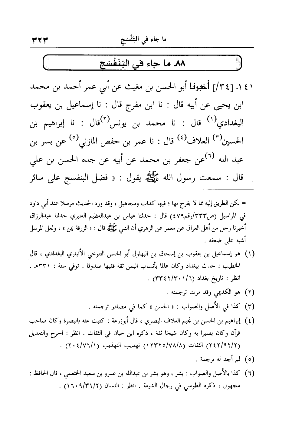 141- أَخْبَرَنَا أَبُو الْحَسَنِ بْنُ مُغِيثٍ عَنْ أَبِي عُمَرَ أَحْمَدَ بْنِ مُحَمَّدِ بْنِ يَحْيَى عَنْ أَبِيهِ قَالَ: نا ابْنُ مُفَرِّجٍ قَالَ: نا إِسْمَاعِيلُ بْنُ يَعْقُوبَ الْبَغْدَادِيُّ قَالَ: نا مُحَمَّدُ بْنُ يُونُسَ قَالَ: نا إِبْرَاهِيمُ بْنُ الْحُسَيْنِ الْعَلافُ قَالَ: نا عُمَرُ بْنُ حَفْصٍ الْمَازِنِيُّ عَنْ بُسْرِ بْنِ عَبْدِ اللَّهِ عَنْ جَعْفَرِ بْنِ مُحَمَّدٍ عَنْ أَبِيهِ عَنْ جَدِّهِ الْحَسَنِ بْنِ عَلِيٍّ قَالَ: سَمِعْتُ رَسُولَ اللَّهِ صَلَّى اللَّهُ عَلَيْهِ وَسَلَّمَ يَقُولُ: "فَضْلُ الْبَنَفْسَجِ عَلَى سَائِرِ -[324]- الأَدْهَانِ كَفَضْلِ الإِسْلامِ عَلَى سَائِرِ الأَدْيَانِ، وَمَا مِنْ وَرَقَةٍ مِنْ وَرَقِ الْهِنْدِبَاءِ إِلا وَعَلَيْهَا قَطْرَةٌ مِنْ مَاءِ الْجَنَّةِ".
