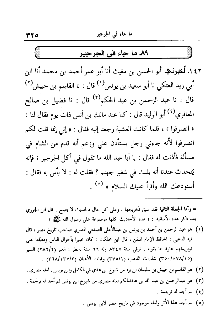 142- أَخْبَرَنِي أَبُو الْحَسَنِ بْنُ مُغِيثٍ أنا أَبُو عُمَرَ أَحْمَدُ بْنُ مُحَمَّدٍ أنا ابْنُ أَبِي زَيْدٍ الْعَتَكِيُّ نا أَبُو سَعِيدِ بْنُ يُونُسَ قَالَ: نا الْقَاسِمُ بْنُ حُبَيْشٍ قَالَ: نا عَبْدُ الرَّحْمَنِ بْنُ عَبْدِ الْحَكَمِ قَالَ: نا فُضَيْلُ بْنُ صَالِحٍ الْمَعَافِرِيُّ أَبُو الْوَلِيدِ قَالَ: كُنَّا عِنْدَ مَالِكِ بْنِ أَنَسٍ ذَاتَ يَوْمٍ فَقَالَ لَنَا: "انْصَرِفُوا"، فَلَمَّا كَانَتِ الْعَشِيَّةُ رَجَعْنَا إِلَيْهِ فَقَالَ: "إِنِّي إِنَّمَا قُلْتُ لَكُمُ انْصَرِفُوا لأَنَّهُ جَاءَنِي رَجُلٌ يبستأذن عَلَيَّ وَزَعَمَ أَنَّهُ قَدِمَ مِنَ الشَّامِ فِي مَسْأَلَةٍ فَأَذِنْتُ لَهُ فَقَالَ: يَا أَبَا عَبْدِ اللَّهِ مَا تَقُولُ فِي أَكْلِ الْجِرْجِيرِ؛ فَإِنَّهُ يُتحدث عِنْدَنَا أَنَّهُ يُلْبِثُ فِي شَفِيرِ جَهَنَّمَ؟ فَقُلْتُ لَهُ: لا بَأْسَ بِهِ فَقَالَ: أَسْتَوْدِعُكَ اللَّهَ وَأَقْرَأُ عَلَيْكَ السَّلامُ".