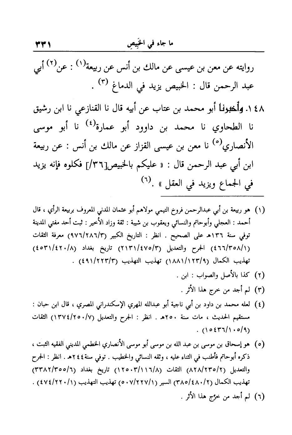 148- وأَخْبَرَنَا أَبُو مُحَمَّدِ بْنُ عَتَّابٍ عَنْ أَبِيهِ قَالَ نا الْقَنَازِعِيُّ نا ابْنُ رَشِيقٍ نا الطَّحَاوِيُّ نا محمد بن داوود أَبُو عُمَارَةَ نا أَبُو مُوسَى الأَنْصَارِيُّ نا مَعْنُ بْنُ عِيسَى الْقَزَّازُ عَنْ مَالِكِ بْنِ أَنَسٍ: عَنْ رَبِيعَةَ بْنِ أَبِي عَبْدِ الرَّحْمَنِ قَالَ: "عَلَيْكُمْ بِالْخَبِيصِ فَكُلُوهُ فَإِنَّهُ يَزِيدُ فِي الْجِمَاعِ وَيَزِيدُ فِي الْعَقْلِ".