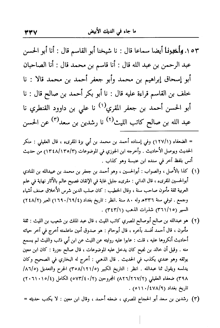 153- وَأَخْبَرَنَا أَيْضًا سَمَاعًا قَالَ: نا شَيْخُنَا أَبُو الْقَاسِمِ قَالَ: أنا أَبُو الْحَسَنِ عَبْدُ الرَّحْمَنِ بْنُ عَبْدِ اللَّهِ قَالَ: أنا قَاسِمُ بْنُ مُحَمَّدٍ قَالَ: أنا الصَّاحِبَانِ أَبُو إِسْحَاقَ إِبْرَاهِيمُ بْنُ مُحَمَّدِ وَأَبُو جَعْفَرٍ أَحْمَدُ بْنُ مُحَمَّدٍ قَالا: نا خَلَفُ بْنُ الْقَاسِمِ قِرَاءَةً عَلَيْهِ قَالَ: نا أَبُو بَكْرٍ أَحْمَدُ بْنُ صَالِحٍ قَالَ: نا أَبُو الْحَسَنِ أَحْمَدُ بْنُ جَعْفَرٍ الْمُقْرِي نا عَلِيُّ بْنُ داوود الْقَنْطَرِيُّ نا عَبْدُ اللَّهِ بْنُ صَالِحٍ كَاتِبُ اللَّيْثِ نا رِشْدِينُ بْنُ سَعْدٍ عَنِ الْحَسَنِ -[338]- بْنِ ثَوْبَانَ وَغَيْرِهِ عَنْ يَزِيدَ بْنِ أَبِي حَبِيبٍ عَنْ سَالِمِ بْنِ عَبْدِ اللَّهِ بْنِ عُمَرَ عَنْ أَبِيهِ قَالَ: قَالَ رَسُولُ اللَّهِ صَلَّى اللَّهُ عَلَيْهِ وَسَلَّمَ: "لا تَسَبُّوا الدِّيكَ الأَبْيَضَ؛ فَإِنَّهُ صَدِيقِي وَأَنَا صَدِيقُهُ وَعَدُوُّهُ عَدُوِّي، وَالَّذِي بعثني بالحق لو يعلم بنو آدَمَ مَا فِي قُرْبِهِ لاشْتَرَوْا رِيشَهُ وَلَحْمَهُ بِالذَّهَبِ وَالْفِضَّةِ، وَإِنَّهُ لَيَطْرُدُ مَدَى صَوْتِهِ مِنَ الْجِنِّ".
