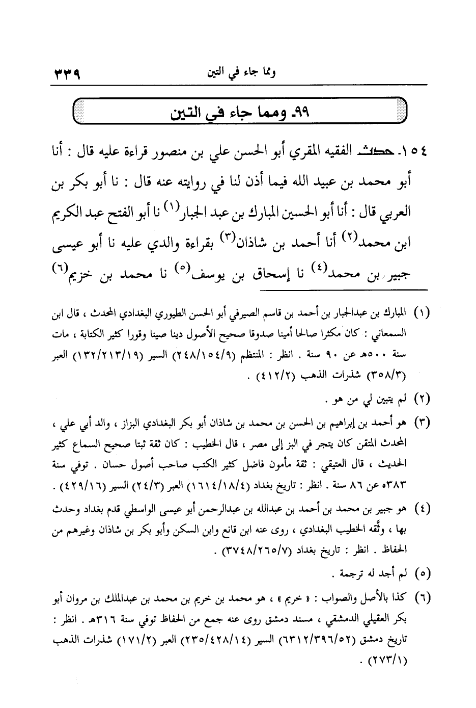 154- حَدَّثَ الْفَقِيهُ الْمُقْرِي أَبُو الْحَسَنِ عَلِيُّ بْنُ مَنْصُورٍ قِرَاءَةً عَلَيْهِ قَالَ: أنا أَبُو مُحَمَّدِ بْنُ عُبَيْدِ اللَّهِ فِيمَا أَذِنَ لَنَا فِي رِوَايَتِهِ عَنْهُ قَالَ: نا أَبُو بَكْرِ بْنُ الْعَرَبِيِّ قَالَ: أنا أَبُو الْحُسَيْنِ الْمُبَارَكُ بْنُ عَبْدِ الْجَبَّارِ نا أَبُو الْفَتْحِ عَبْدُ الْكَرِيمِ بْنُ مُحَمَّدٍ أنا أَحْمَدُ بْنُ شَاذَانَ بِقِرَاءَةِ وَالِدِي عَلَيْهِ نا أَبُو عِيسَى جُبَيْرُ بْنُ مُحَمَّدٍ نا إِسْحَاقُ بْنُ يُوسُفَ نا مُحَمَّدُ بْنُ خُزَيْمٍ -[340]- نا عَبْدُ اللَّهِ بْنُ مُحَمَّدٍ نا عِيسَى بْنُ يُونُسَ عَنِ الأَوْزَاعِيِّ عَنْ يَحْيَي بْنِ أَبِي كَثِيرٍ عَنْ أَبِي سَلَمَةَ عَنْ أَبِي هُرَيْرَةَ قَالَ: أُتِيَ رَسُولُ اللَّهِ صَلَّى اللَّهُ عَلَيْهِ وَسَلَّمَ بِطَبَقٍ فِيهِ تِينٌ فَأَطَلَّ وَقَالَ لأَصْحَابِهِ: "كُلُوا؛ فَلْو قُلْتُ أَنَّ فَاكِهَةً نَزَلَتْ مِنَ الْجَنَّةِ بِلا عُجْمٍ لَقُلْتُ هَذَا التِّينُ، كُلُوهُ؛ فَإِنَّهُ يَقْطَعُ الْبَوَاسِيرَ وَيَنْفَعُ مِنَ النِّقْرِسِ".