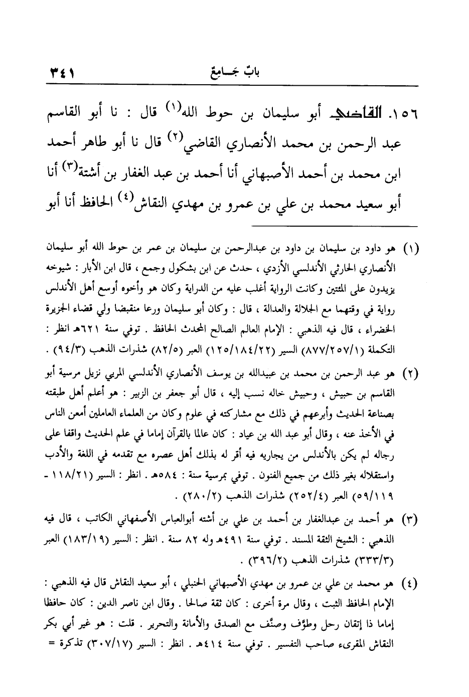 156- الْقَاضِي أَبُو سُلَيْمَانَ بْنُ حَوْطِ اللَّهِ قَالَ: نا أَبُو الْقَاسِمِ عَبْدُ الرَّحْمَنِ بْنُ مُحَمَّدٍ الأَنْصَارِيُّ الْقَاضِي قَالَ نا أَبُو طَاهِرٍ أَحْمَدُ بْنُ مُحَمَّدِ بْنِ أَحْمَدَ الأَصْبَهَانِيُّ أنا أَحْمَدُ بْنُ عَبْدِ الْغَفَّارِ بْنِ أَشْتَةَ أنا أَبُو سَعِيدٍ مُحَمَّدُ بْنُ عَلِيِّ بْنِ عَمْرِو بْنِ مَهْدِيٍّ النَّقَّاشُ الْحَافِظُ أنا أَبُو الْحَسَنِ -[342]- سَهْلُ بْنُ عَبْدِ اللَّهِ بْنِ حَفْصٍ التُّسْتَرِيُّ نا أَبُو يَحْيَى زَكَرِيَّاءُ بْنُ يَحْيَى بْنِ دُرُسْتَ نا عَبْدُ اللَّهِ بْنُ حُبَيْقٍ نا يُوسُفُ بْنُ أَسْبَاطٍ عَنْ مُحَمَّدِ بْنِ عُبَيْدِ اللَّهِ وَسُفْيَانَ الثَّوْرِيِّ عَنْ صَفْوَانَ بْنِ سُلَيْمٍ عَنْ -[343]- أَنَسِ بْنِ مَالِكٍ رَضِيَ اللَّهُ عَنْهُ قَالَ: كَانَ النَّبِيُّ صَلَّى اللَّهُ عَلَيْهِ وَسَلَّمَ يَكْرَهُ الْكَيَّ وَيَكْرَهُ الطَّعَامَ الْحَارَّ وَيَقُولُ: "عَلَيْكُمْ بِالْبَارِدِ؛ فَإِنَّهُ ذُو بَرَكَةٍ، أَلا وَإِنَّ الْحَارَّ لا بَرَكَةَ لَهُ"، وَكَانَتْ لَهُ مُكْحُلَةٍ يَكْتَحِلُ بِهَا عِنْدَ النَّوْمِ ثَلاثًا ثَلاثًا.