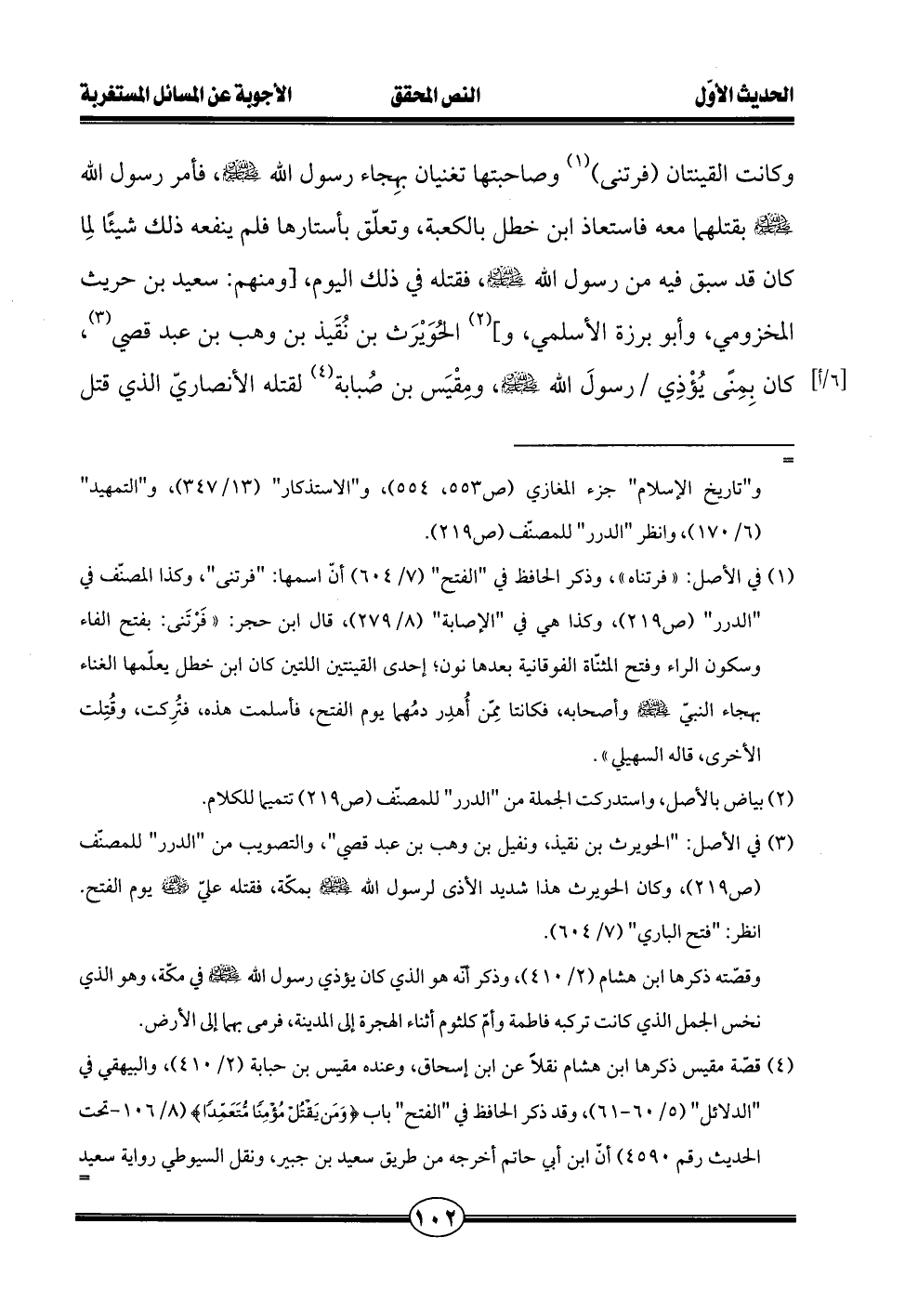 وكانت القينتان (فرتني) (¬1) وصاحبتها تغنيان بهِجاء رسول الله - صلى الله عليه وسلم -، فأمر رسول الله - صلى الله عليه وسلم - بقتلهما معه فاستعاذ ابن خطل بالكعبة، وتعلّق بأستارها فلم ينفعه ذلك شيئًا لمِا كان قد سبق فيه من رسول الله - صلى الله عليه وسلم -، فقتله في ذلك اليوم، [ومنهم: سعيد بن حريث المخزومي، وابو برزة الأسلمي، و] (¬2) الحُوَيْرَث بن نُقَيذ بن وهب بن عبد قصي (¬3)، كان بِمِنًى يُؤْذِي رسولَ الله - صلى الله عليه وسلم -، ومِقْيَس بن صُبابة (¬4) لقتله الأنصاريّ الذي قتل